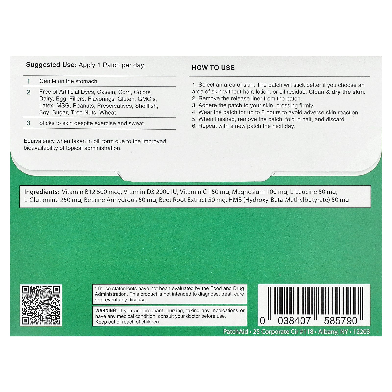 Vitamin b12 500 mcg, vitamin d3 2000 iu, vitamin c 150 mg, magnesium 100 mg, l-leucine 50 mg, l-glutamine 250 mg, betaine anhydrous 50 mg, beet root extract 50 mg, hmb (hydroxy-beta-methylbutyrate) 50 mg.