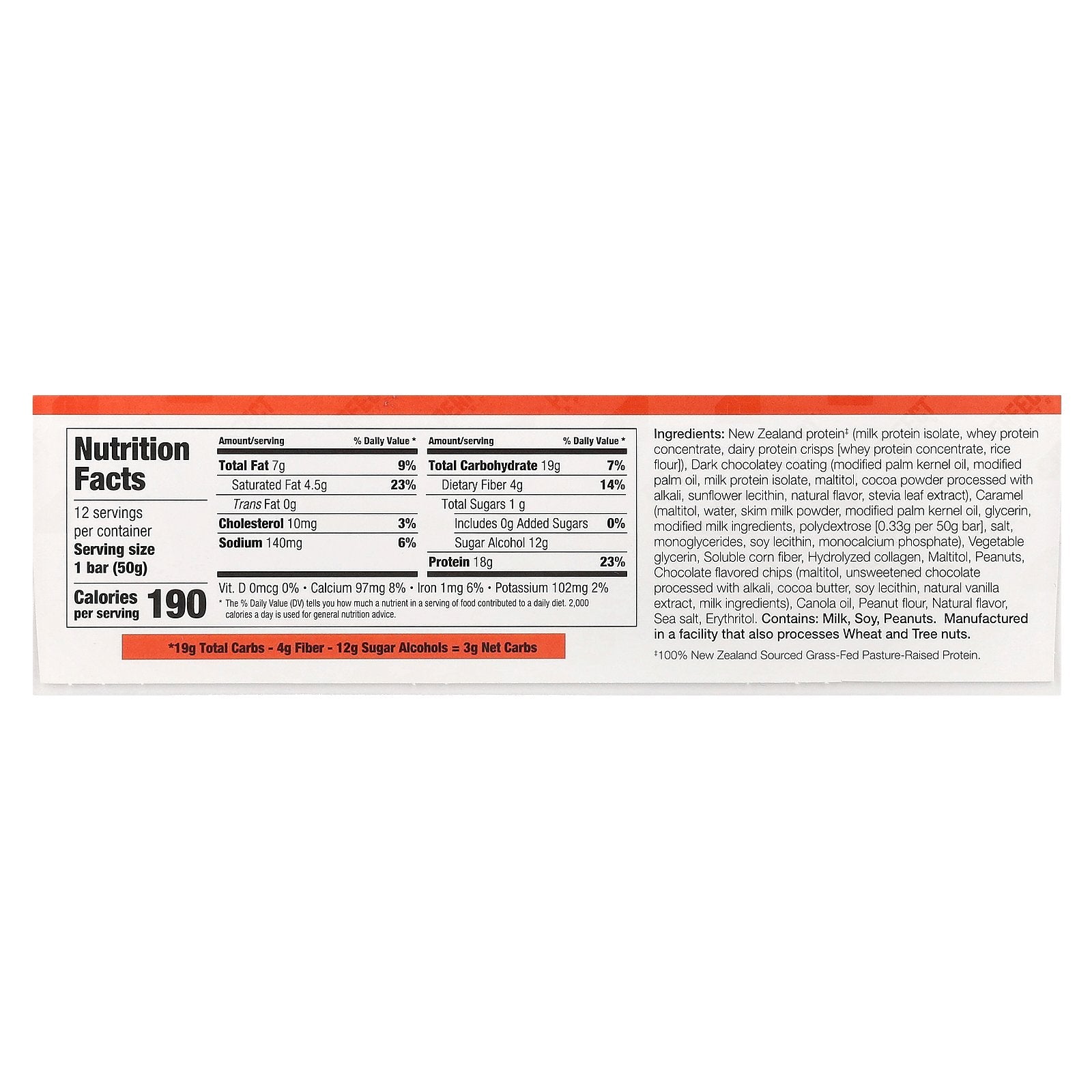 New zealand protein‡ (milk protein isolate, whey protein concentrate, dairy protein crisps [whey protein concentrate, rice flour]), dark chocolatey coating (modified palm kernel oil, modified palm oil, milk protein isolate, maltitol, cocoa powder processed with alkali, sunflower lecithin, natural flavor, stevia leaf extract), caramel (maltitol, water, skim milk powder, modified palm kernel oil, glycerin, modified milk ingredients, polydextrose [0.33 g per 50 g bar], salt, monoglycerides, soy lecithin, monocalcium phosphate), vegetable glycerin, soluble corn fiber, hydrolyzed collagen, maltitol, peanuts, chocolate flavored chips (maltitol, unsweetened chocolate processed with alkali, cocoa butter, soy lecithin, natural vanilla extract, milk ingredients), canola oil, peanut flour, natural flavor, sea salt, erythritol.