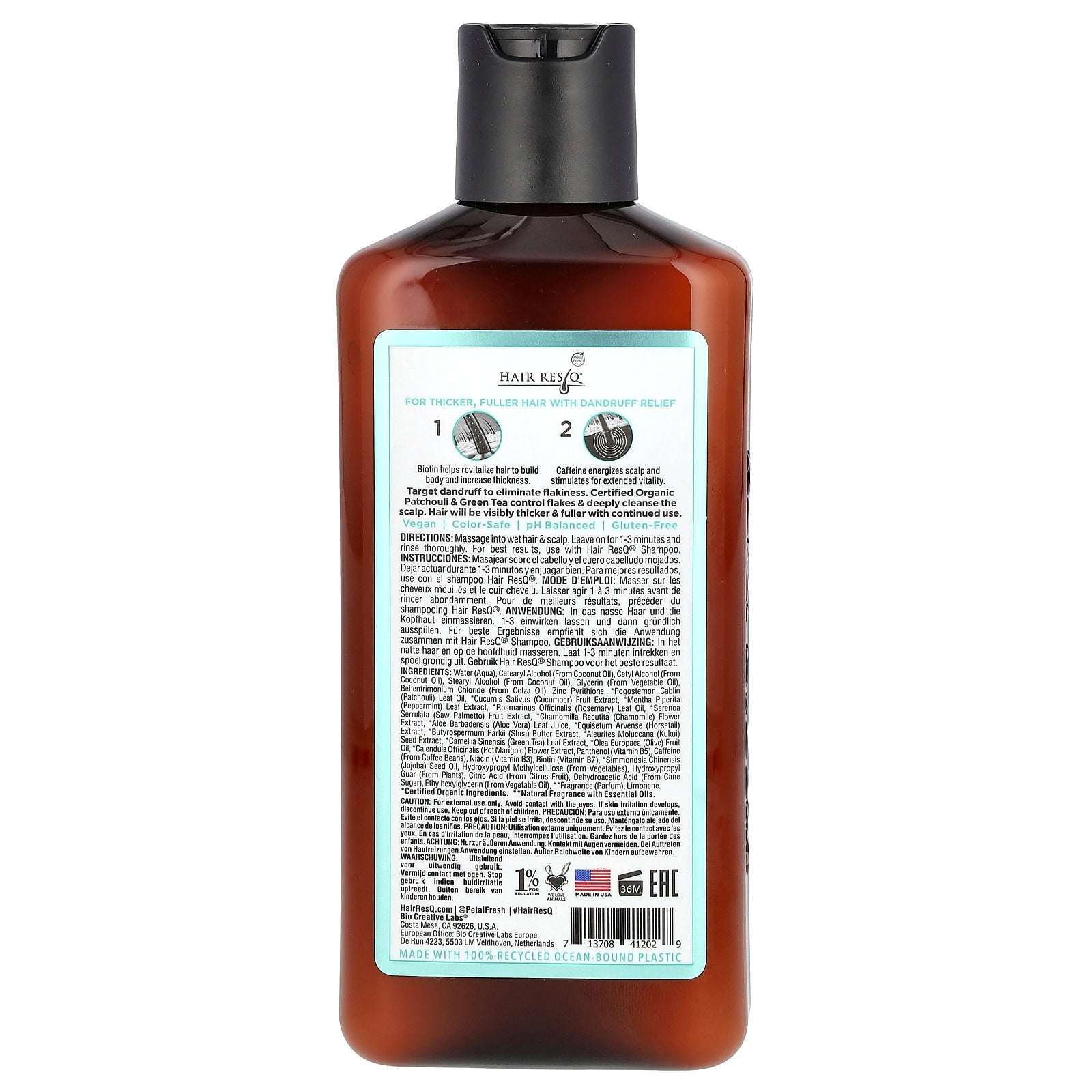 Water (aqua), cetearyl alcohol (from coconut oil), cetyl alcohol (from coconut oil), stearyl alcohol (from coconut oil), glycerin (from vegetable oil), behentrimonium chloride (from colza oil), zinc pyrithione, * pogostemon cablin (patchouli) leaf oil, *cucumis sativus (cucumber) fruit extract, *mentha piperita peppermint) leaf extract, *rosmarinus officinalis (rosemary) leaf oil, * serenoa serrulata (saw palmetto) fruit extract, * chamomilla recutita (chamomile) flower extract, *aloe barbadensis (aloe vera) leaf juice, * equisetum arvense (horsetail) extract, *butyrospermum parkii (shea) butter extract, *aleurites moluccana (kukui) seed extract, * camellia sinensis (green tea) leaf extract, * olea europaea (olive) fruit oil, *calendula officinalis (pot marigold) flower extract, panthenol (vitamin b5), caffeine (from coffee beans), niacin (vitamin b3), biotin (vitamin b7), * simmondsia chinensis (jojoba) seed oil, hydroxypropyl methylcellulose (from vegetables), hydroxypropyl guar (from plants), citric acid (from citrus fruit), dehydroacetic acid (from cane sugar), ethylhexylglycerin (from vegetable oil), ** fragrance (parfum), limonene.