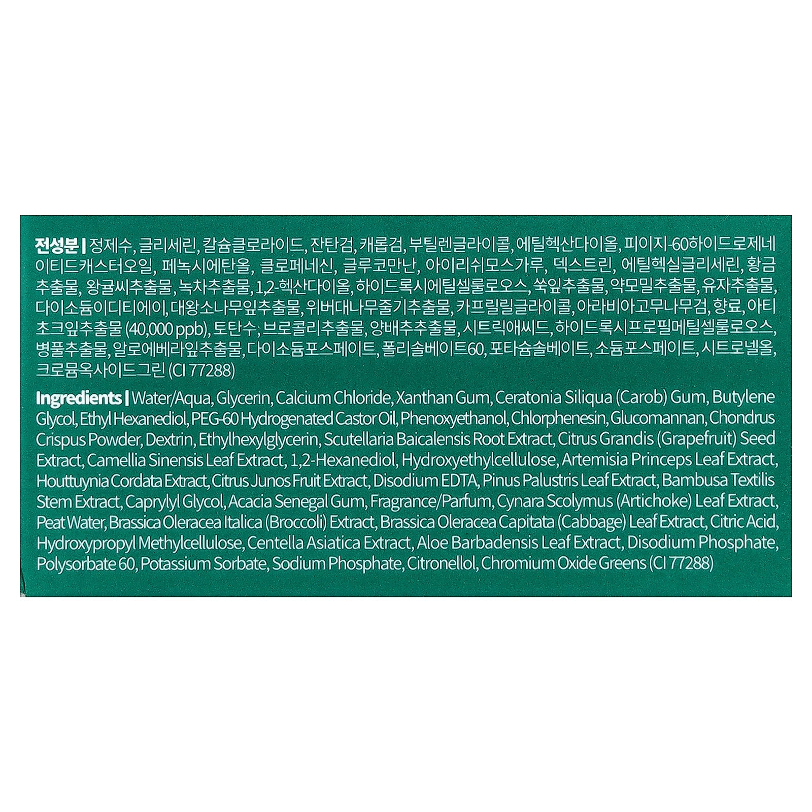Water/aqua, glycerin, calcium chloride, xanthan gum, ceratonia siliqua (carob) gum, butylene glycol, ethyl hexanediol, peg-60 hydrogenated castor oil, phenoxyethanol, chlorphenesin, glucomannan, chondrus crispus powder, dextrin, ethylhexylglycerin, scutellaria baicalensis root extract, citrus grandis (grapefruit) seed extract, camellia sinensis leaf extract, 1,2-hexanediol, hydroxyethylcellulose, artemisia princeps leaf extract, houttuynia cordata extract, citrus junos fruit extract, disodium edta, pinus palustris leaf extract, bambusa textilis stem extract, caprylyl glycol, acacia senegal gum, fragrance/parfum, cynara scolymus (artichoke) leaf extract, peat water, brassica oleracea italica (broccoli) extract, brassica oleracea capitata (cabbage) leaf extract, citric acid, hydroxypropyl methylcellulose, centella asiatica extract, aloe barbadensis leaf extract, disodium phosphate, polysorbate 60, potassium sorbate, sodium phosphate, citronellol, chromium oxide greens (ci 77288).