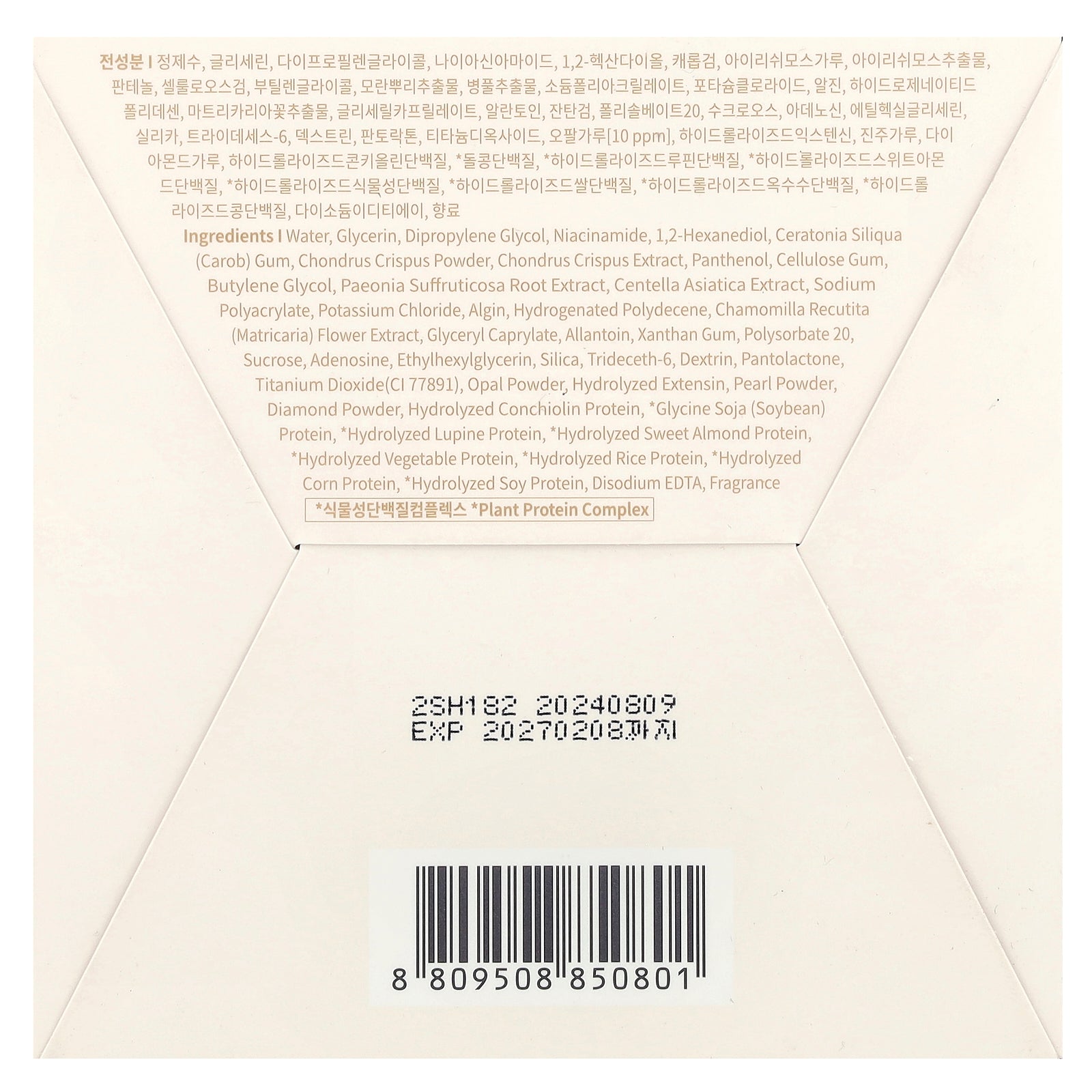 Water, glycerin, dipropylene glycol, niacinamide, 1,2-hexanediol, ceratonia siliqua (carob) gum, chondrus crispus powder, chondrus crispus extract, panthenol, cellulose gum, butylene glycol, paeonia suffruticosa root extract, centella asiatica extract, sodium polyacrylate, potassium chloride, algin, hydrogenated polydecene, chamomilla recutita (matricaria) flower extract, glyceryl caprylate, allantoin, xanthan gum, polysorbate 20, sucrose, adenosine, ethylhexylglycerin, silica, trideceth-6, dextrin, pantolactone, titanium dioxide(ci 77891), opal powder, hydrolyzed extensin, pearl powder, diamond powder, hydrolyzed conchiolin protein, * glycine soja (soybean) protein, * hydrolyzed lupine protein, * hydrolyzed sweet almond protein, *hydrolyzed vegetable protein, * hydrolyzed rice protein, * hydrolyzed corn protein, * hydrolyzed soy protein, disodium edta, fragrance