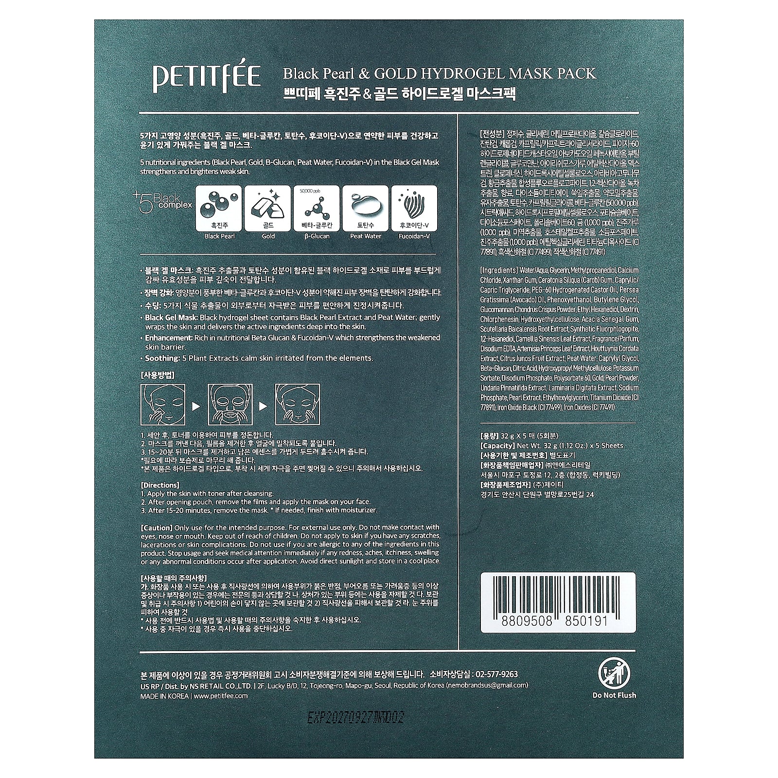 - Black Gel Mask: Black hydrogel sheet contains black pearl extract and peat water; gently wraps the skin and delivers the active ingredients deep into the skin.