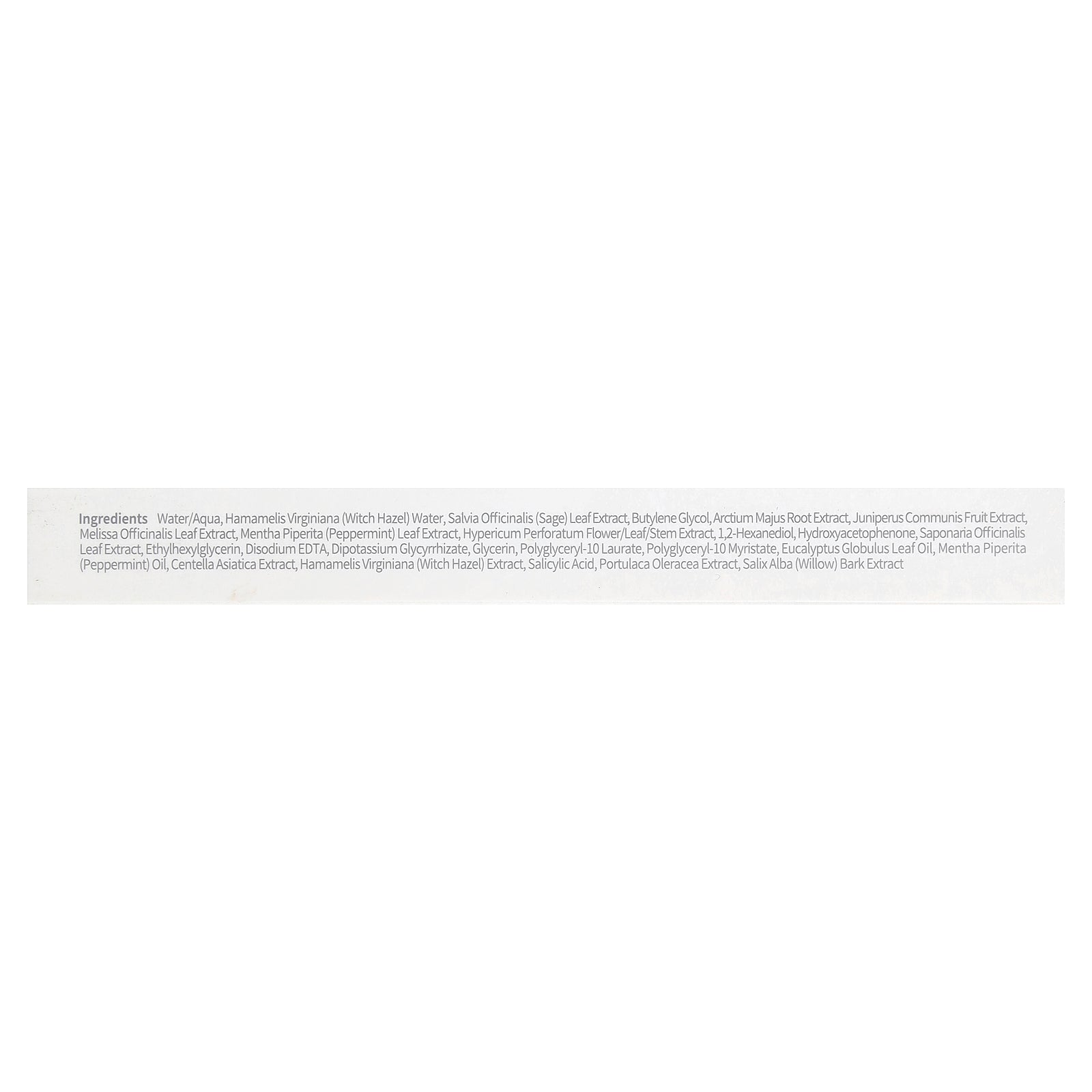 Water, hamamelis virginiana (witch hazel) water, salvia officinalis (sage) leaf extract, butylene glycol, arctium majus root extract, juniperus communis fruit extract, melissa officinalis leaf extract, mentha piperita (peppermint) leaf extract, hypericum perforatum flower/leaf/stem extract, 1,2-hexanediol, hydroxyacetophenone, saponaria officinalis leaf extract, ethylhexylglycerin, disodium edta, dipotassium glycyrrhizate, glycerin, polyglyceryl-10 laurate, polyglyceryl-10 myristate, eucalyptus globulus leaf oil, mentha piperita (peppermint) oil, centella asiatica extract, hamamelis virginiana (witch hazel) extract, salicylic acid, portulaca oleracea extract, salix alba (willow) bark extract.