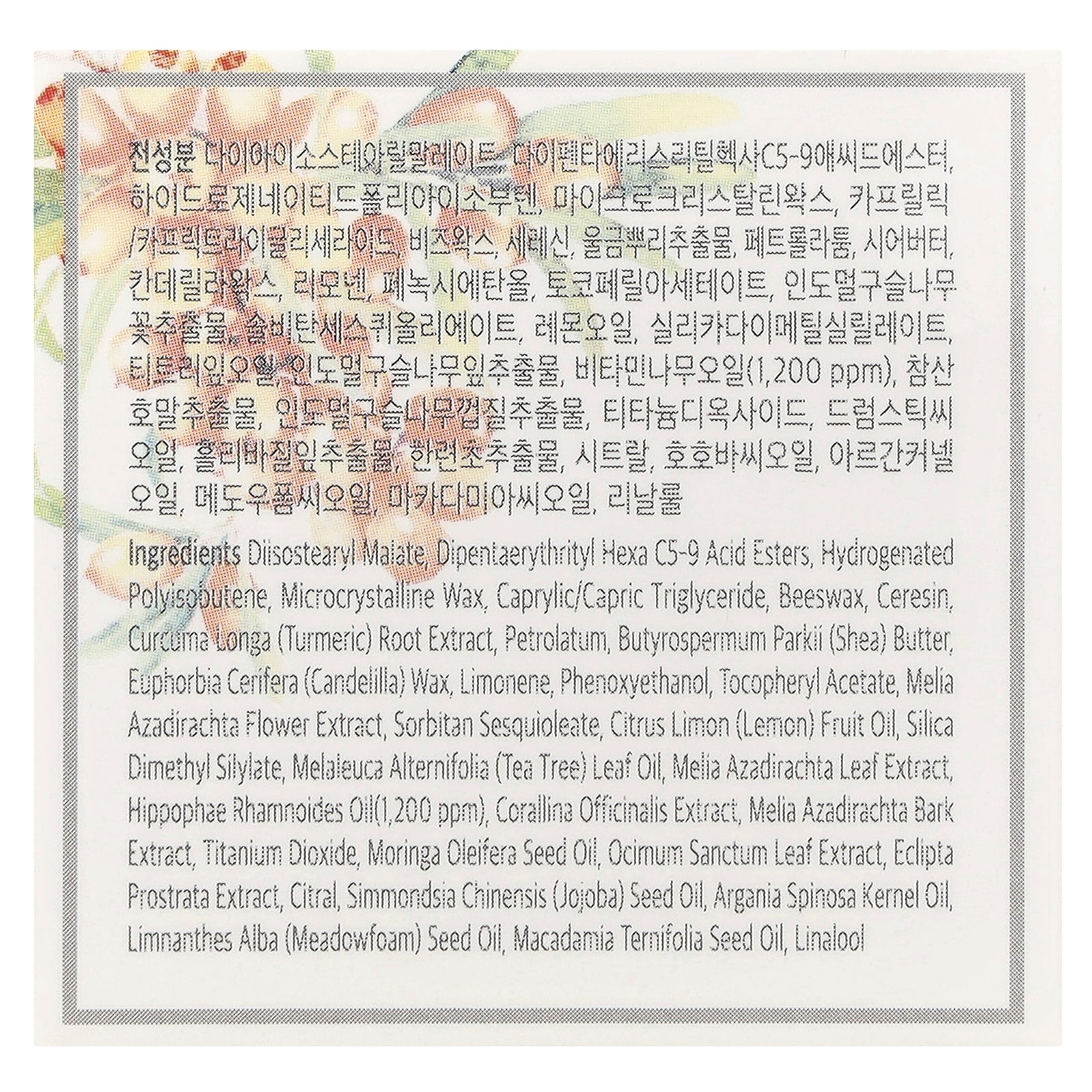 Diisostearyl malate, dipentaerythrityl hexa c5-9 acid esters, hydrogenated polyisobutene, microcrystalline wax, caprylic/capric triglyceride, beeswax, ceresin, curcuma longa (turmeric) root extract, petrolatum, butyrospermum parkii (shea) butter, euphorbia cerifera (candelilla) wax, limonene, phenoxyethanol, tocopheryl acetate, melia azadirachta flower extract, sorbitan sesquioleate, citrus limon (lemon) fruit oil, silica dimethyl silylate, melaleuca alternifolia (tea tree) leaf oil, melia azadirachta leaf extract, hippophae rhamnoides oil (1,200 ppm), corallina officinalis extract, melia azadirachta bark extract, titanium dioxide, moringa oleifera seed oil, ocimum sanctum leaf extract, eclipta prostrata extract, citral, simmondsia chinensis (jojoba) seed oil, argania spinosa kernel oil, limnanthes alba (meadowfoam) seed oil, macadamia ternifolia seed oil, linalool.