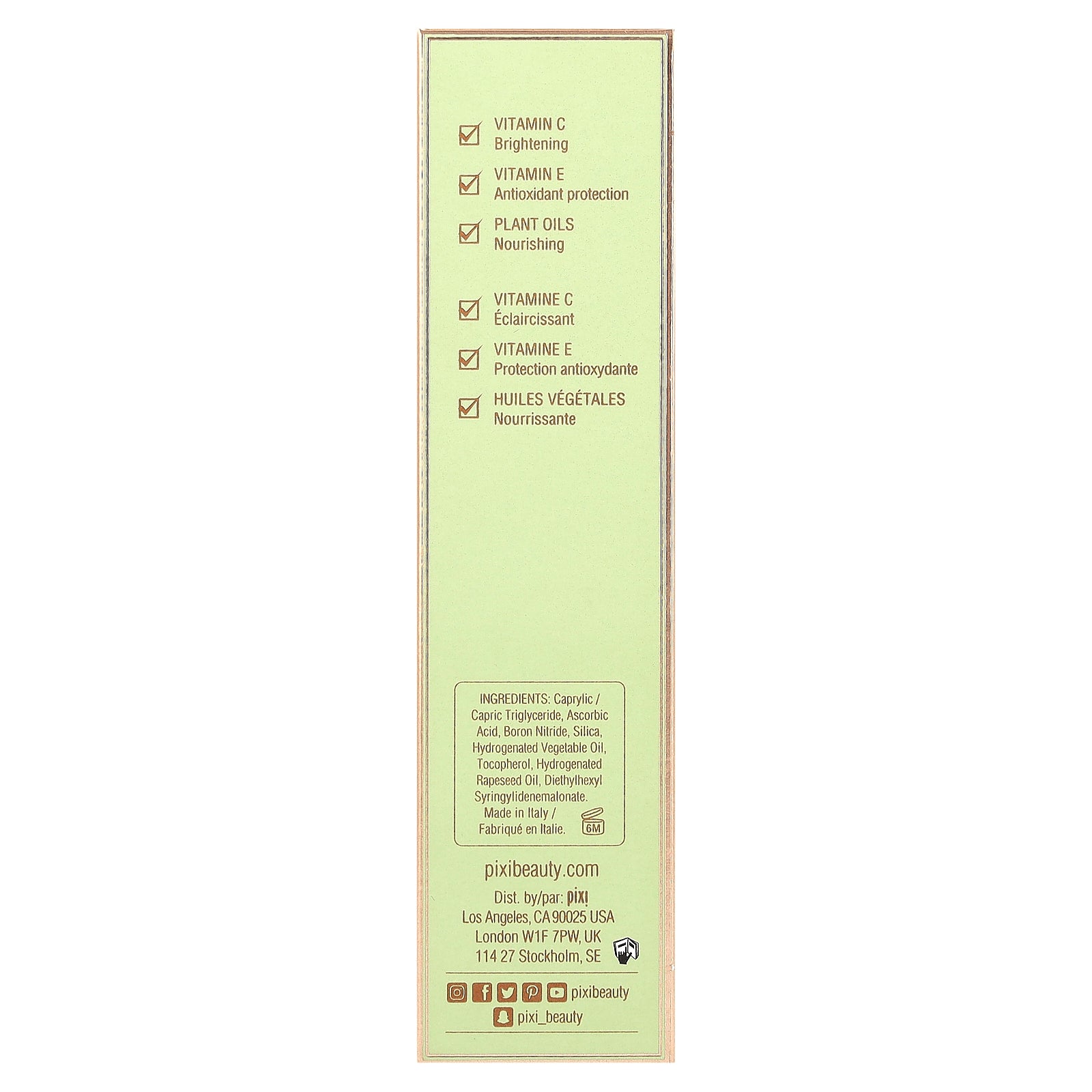 Caprylic/capric triglyceride, ascorbic acid, boron nitride, silica, hydrogenated vegetable oil, tocopherol, hydrogenated rapeseed oil, diethylhexyl syringylidenemalonate.