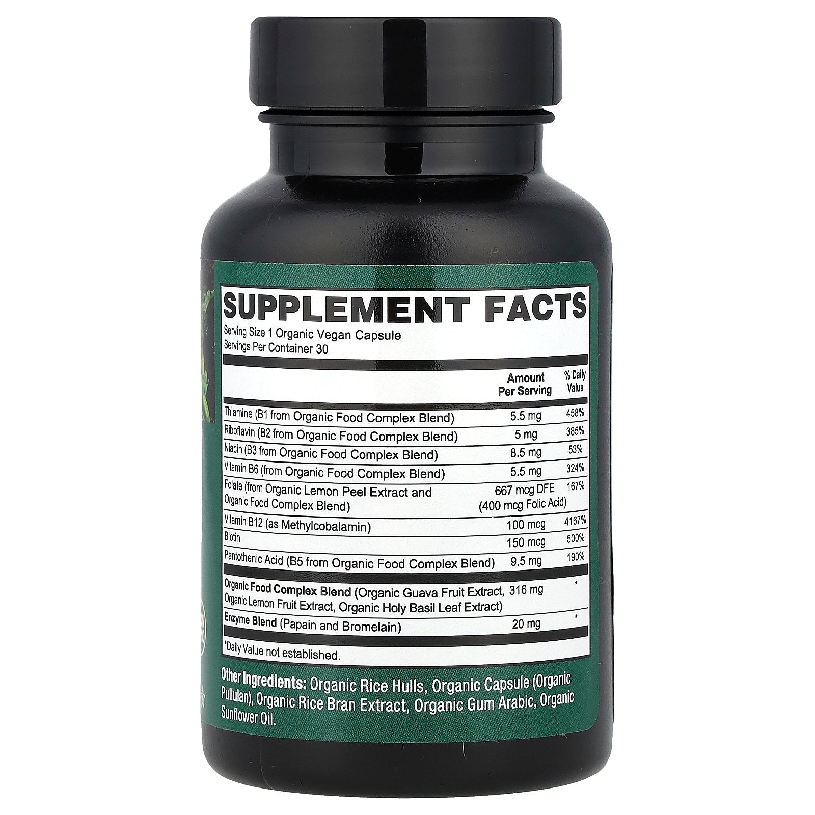 Organic B-Complex delivers essential B-vitamins sourced from 100% organic whole foods like guava, lemon, and basil to support daily energy, stress reduction, and mental focus.