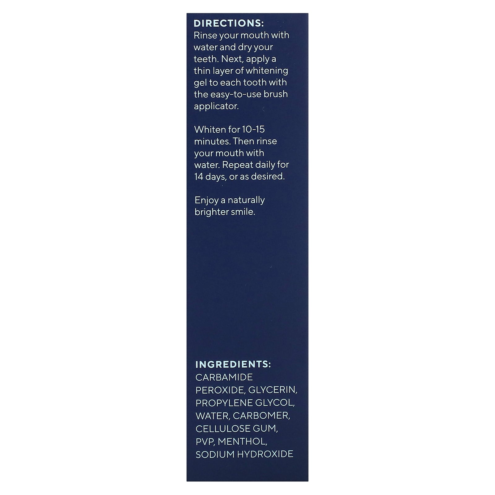 Whiten for 10-15 minutes. Then rinse your mouth with water. Repeat daily for 14 days, or as desired.