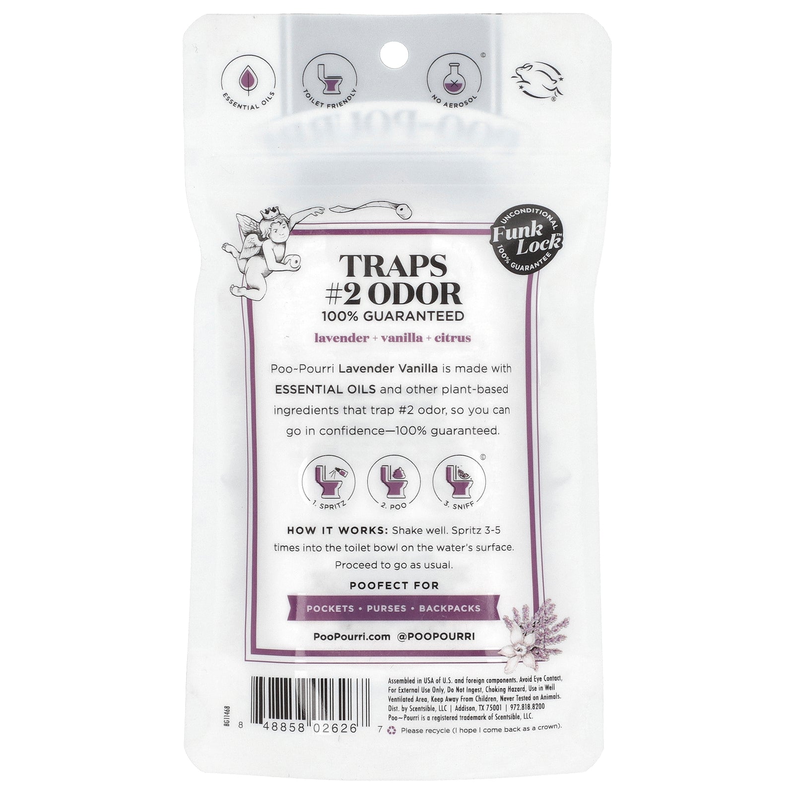 Poo~Pourri Lavender Vanilla is made with Essential Oils and other plant-based ingredients that trap #2 odor, so you can go in confidence - 100% guaranteed.