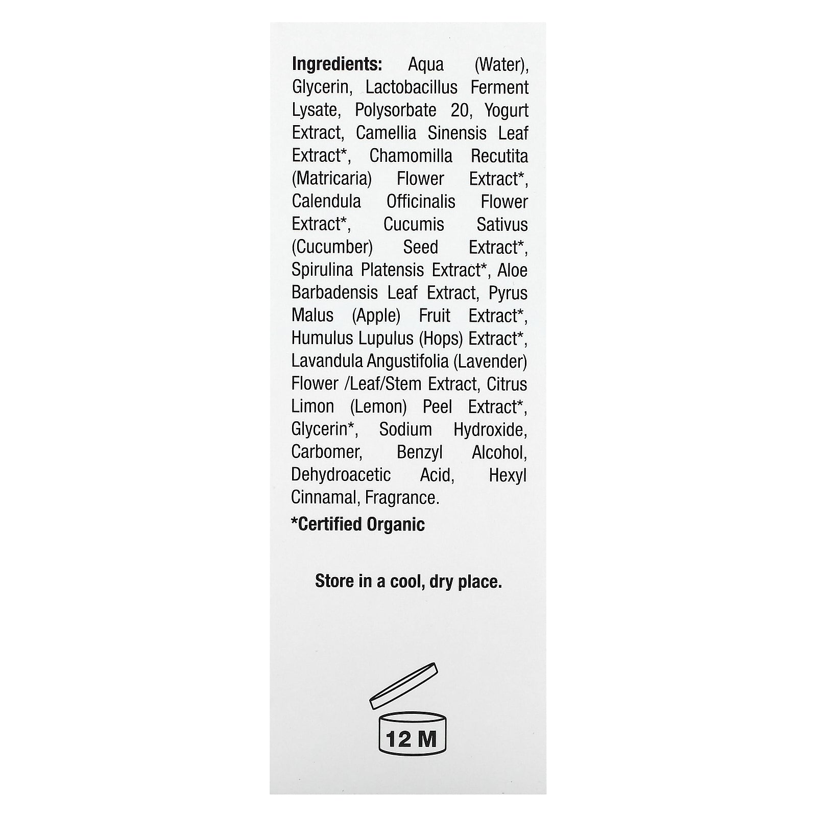 Aqua (Water), Glycerin, Lactobacillus Ferment Lysate, Polysorbate 20, Yogurt Extract, Camellia Sinensis Leaf Extract*, Chamomilla Recutita (Matricaria) Flower Extract*, Calendula Officinalis Flower Extract*, Cucumis Sativus (Cucumber) Seed Extract*, Spirulina Platensis Extract*, Aloe Barbadensis Leaf Extract, Pyrus Malus (Apple) Fruit Extract*, Humulus Lupulus (Hops) Extract*, Lavandula Angustifolia (Lavender) Flower/Leaf/Stem Extract, Citrus Limon (Lemon) Peel Extract*, Glycerin*, Sodium Hydroxide, Carbomer, Benzyl Alcohol, Dehydroacetic Acid, Hexyl Cinnamal, Fragrance.