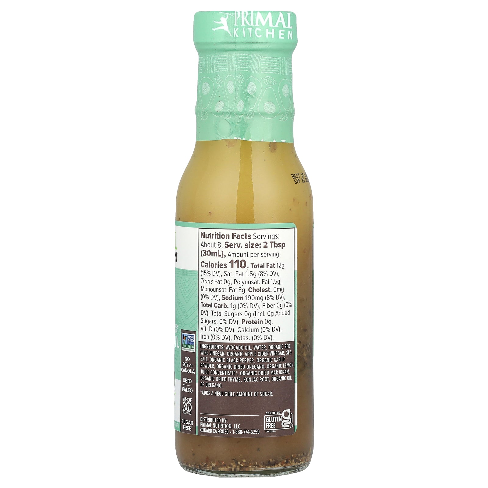 Avocado oil, water, organic red wine vinegar, organic apple cider vinegar, sea salt, organic black pepper, organic garlic powder, organic dried oregano, organic lemon juice concentrate *, organic dried marjoram, organic dried thyme, konjac root, organic oil of oregano.
