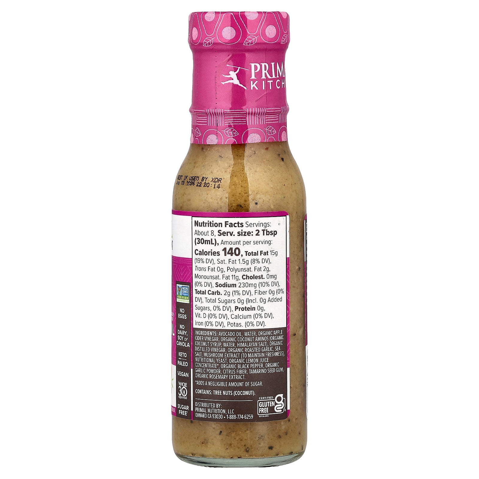 Avocado oil, water, organic apple cider vinegar, organic coconut aminos (organic coconut syrup, water, himalayan salt), organic distilled vinegar, organic roasted garlic, sea salt, mushroom extract (to maintain freshness), nutritional yeast, organic lemon juice concentrate*, organic black pepper, organic garlic powder, citrus fiber, tamarind seed gum, organic rosemary extract.
