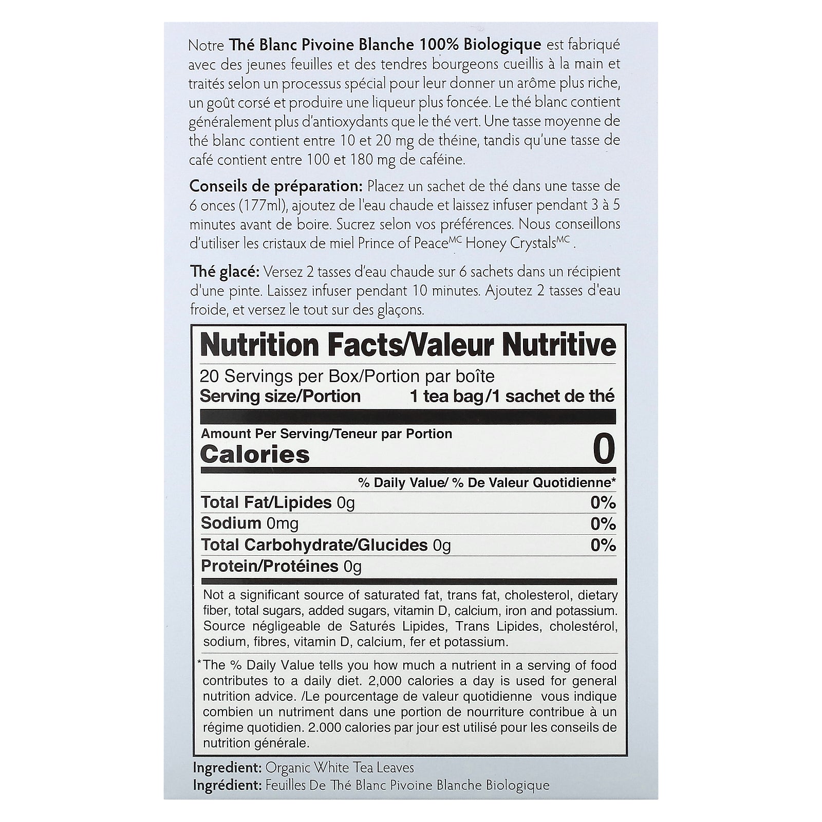 Our 100% Organic White Tea is made from hand-picked young leaves and tender buds that go through a special processing style for a richer aroma, a fuller body, and a darker color. White tea usually has a higher level of antioxidant content compared with green tea. A typical cup of white tea contains about 10-20 mg of caffeine while a cup of coffee ranges from 100 -180 mg.