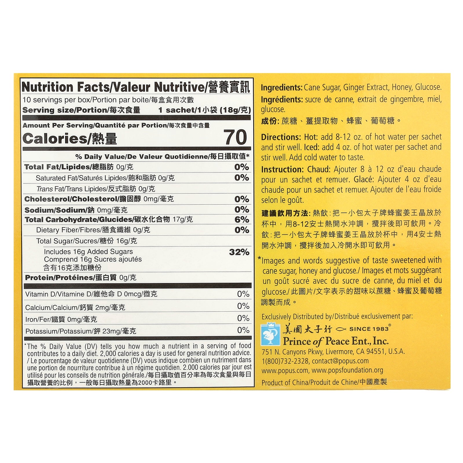 Prince of Peace® brings you all the natural benefits of Ginger and Honey in our special proprietary blend of Ginger Honey Crystals. Each Sachet contains concentrated extract from 14 grams of raw ginger, which creates an appealing aroma and exquisitely smooth taste. The naturally sweet and spicy flavor of this drink makes this a year-round favorite. Rest assured that this product is caffeine-free. If served hot, it will warm you from the inside out. It tastes great iced as well!