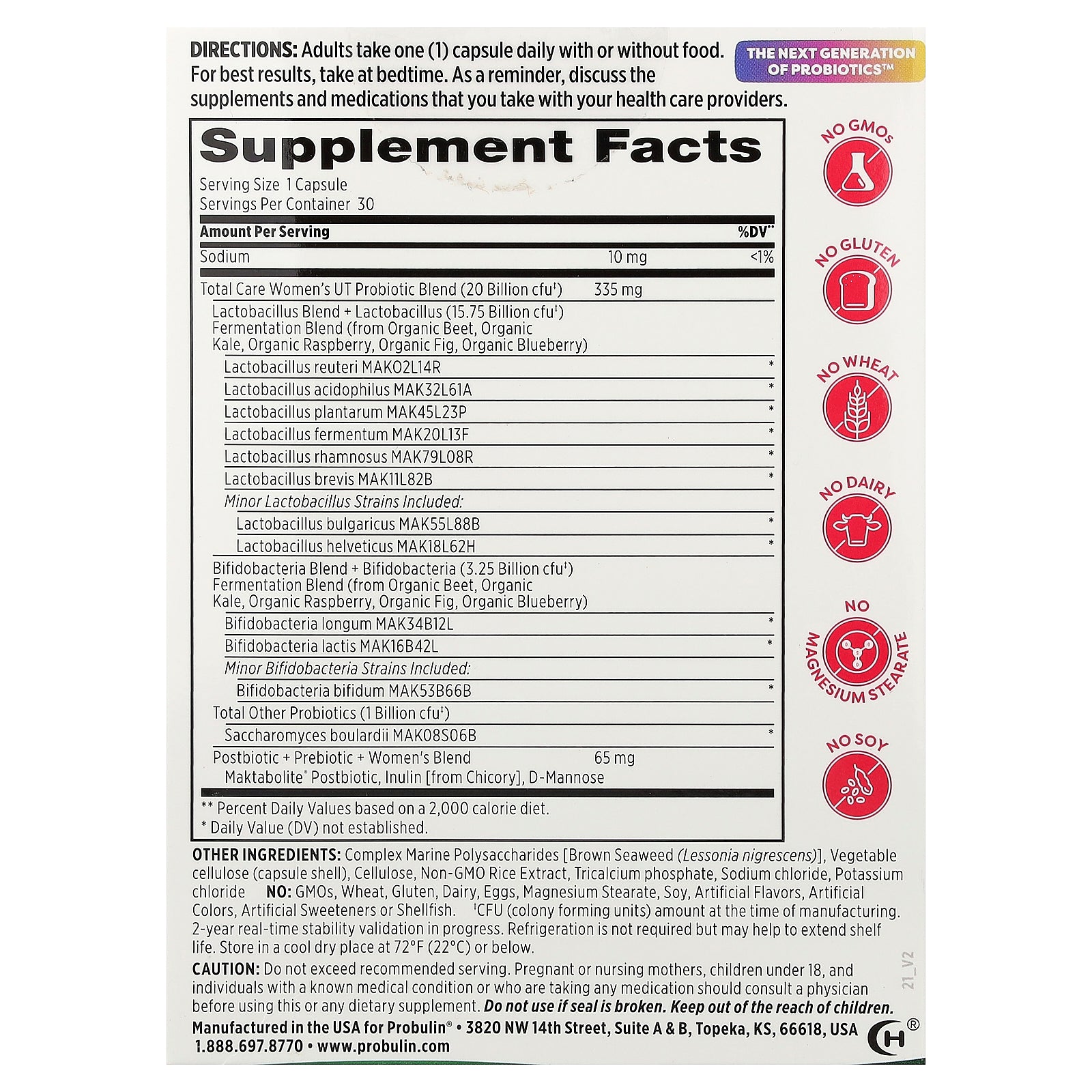 Prebiotic: Probulin's® Total Care Women's UT Probiotic features our prebiotic, which acts as food for the probiotic bacteria.