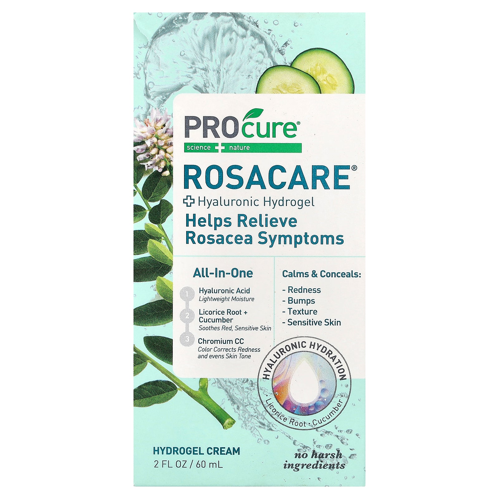 Our Rosacare Hydrogel harnesses the power of Hyaluronic Acid, Vitamin E and Allantoin to moisturize, while Chromium Oxide Greens evens skin tone and covers redness, and Licorice Root and Cucumber Extracts calm and soothe irritated skin. The result - you look and feel better without subjecting your skin to any harsh chemicals.