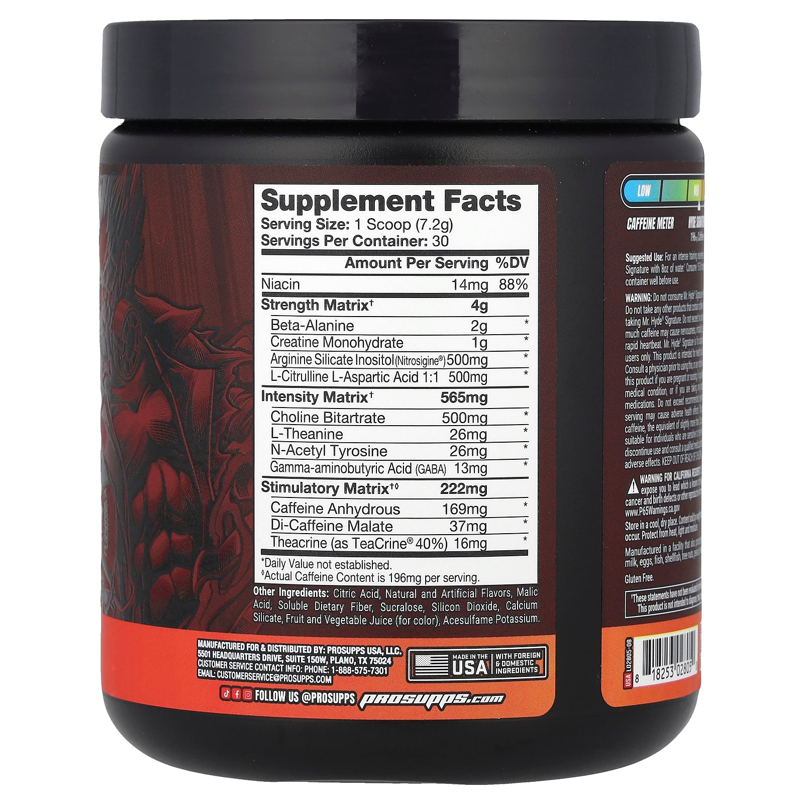Do not consume Mr. Hyde® Signature within 4 hours prior to bedtime. Do not take any other products that contain caffeine or any other stimulants while taking Mr. Hyde® Signature. Do not exceed two servings in a 24-hour period. Too much caffeine may cause nervousness, irritability, sleeplessness and occasional rapid heartbeat. Mr. Hyde® Signature is for advanced exercise and supplement users only. This product is intended for healthy adults, 18 years of age or older. Consult a physician prior to using this, or any other dietary supplement. Do not take this product if you are pregnant or nursing, if you have or suspect you may have a medical condition, or if you are taking any prescription or over-the-counter medications. Do not exceed recommended serving. Exceeding recommended serving may cause adverse health effects. This product contains 196mg of caffeine, the equivalent of slightly more than 2 cups of coffee and may not be suitable for individuals who are sensitive to the effects of caffeine. Immediately discontinue use and consult a qualified medical professional if you experience any adverse effects. Keep out of reach of children.