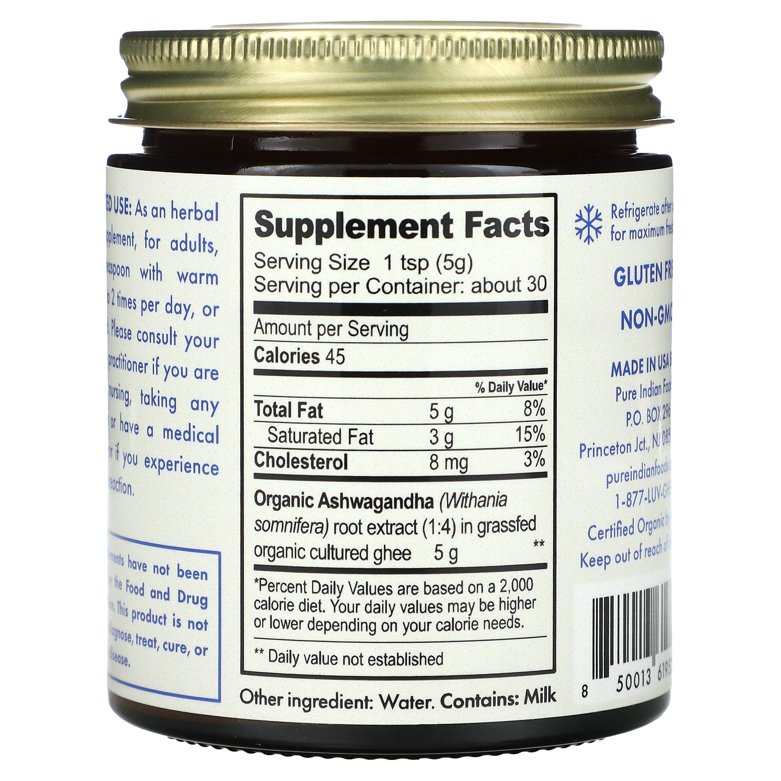 | Organic Ashwagandha (Withania somnifera) root extract (1:4) in grassfed organic cultured ghee | 5 g | ** |