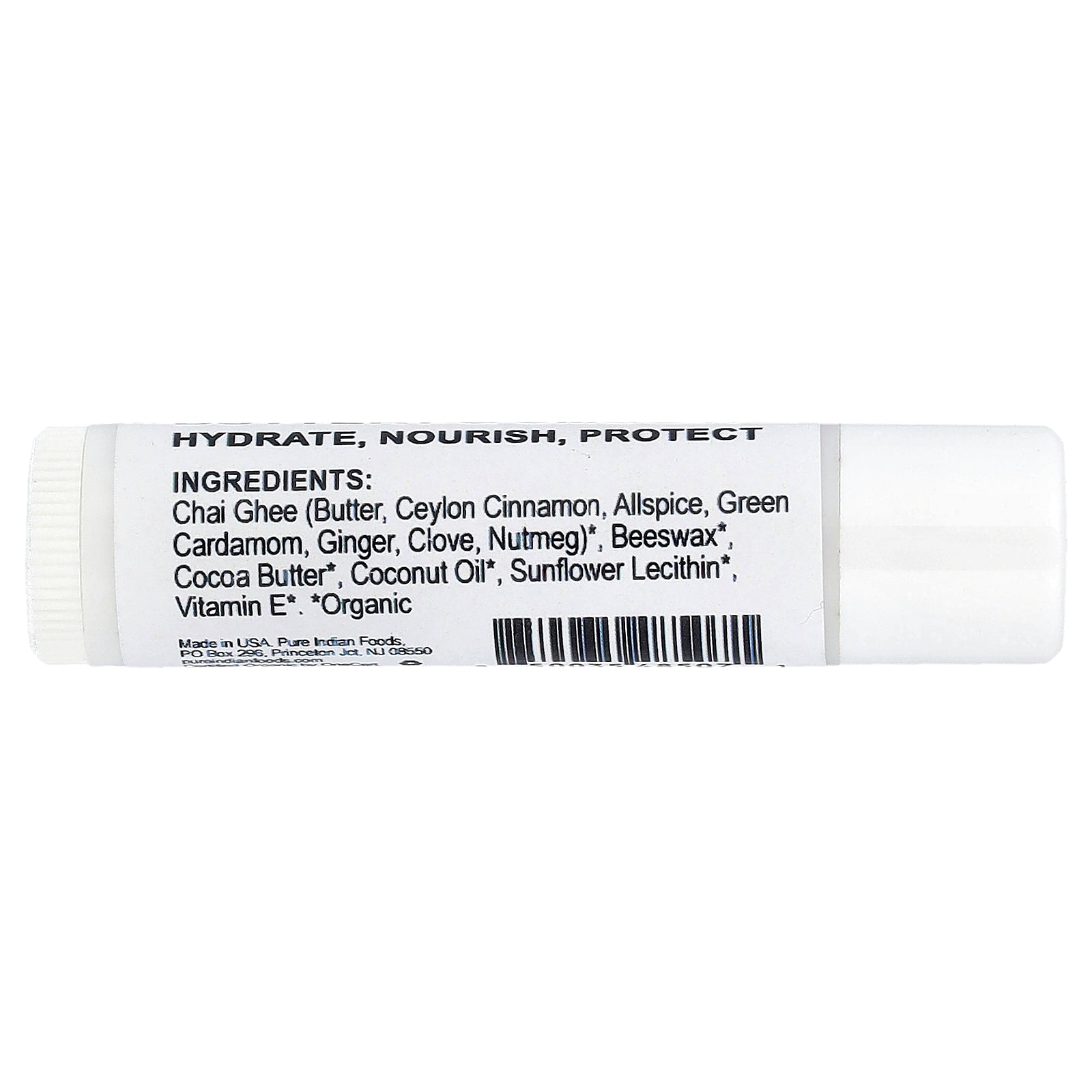 Chai ghee (butter, ceylon cinnamon, allspice, green cardamom, ginger, clove, nutmeg) *, beeswax* cocoa butter *, coconut oil *, sunflower lecithin vitamin e*.