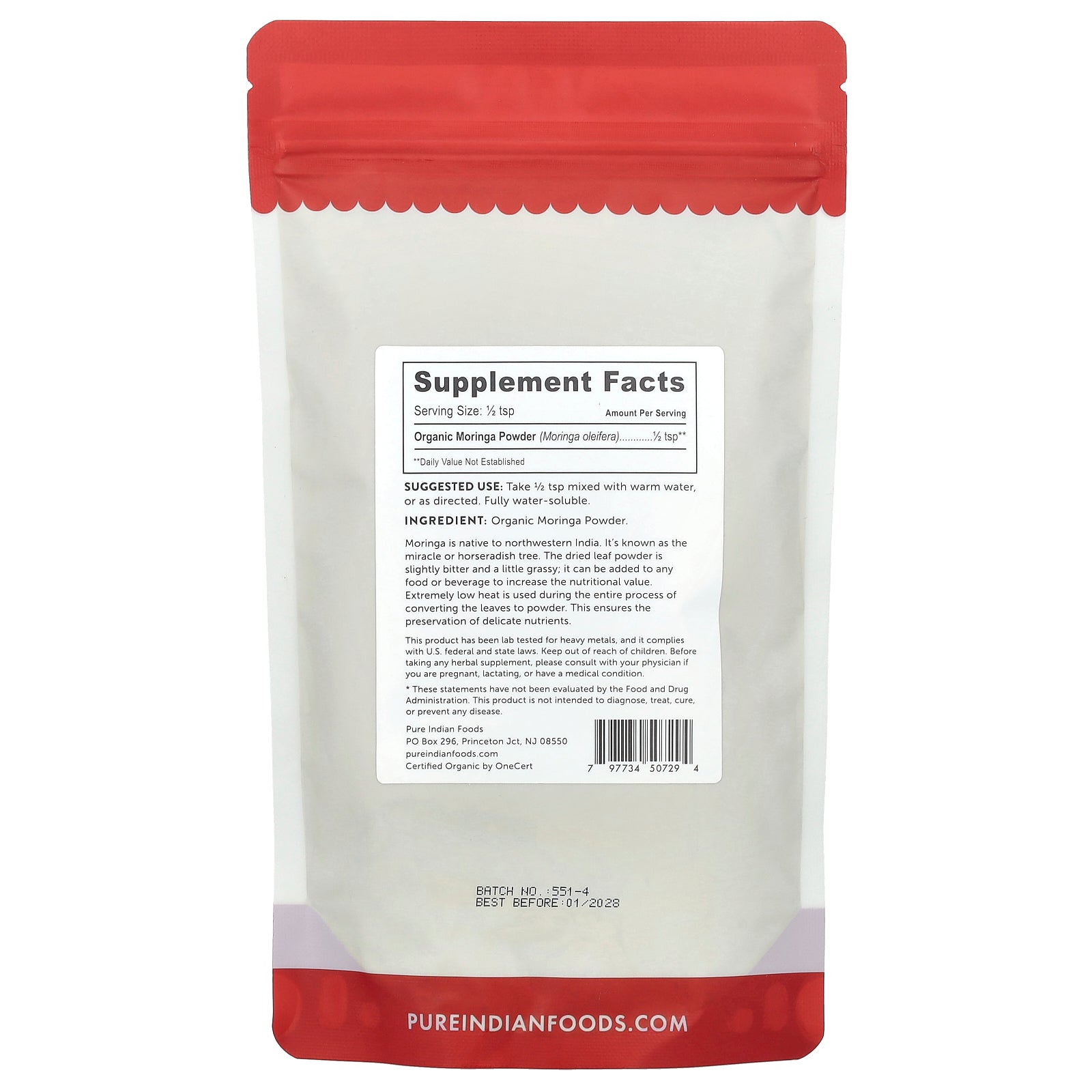 Moringa is native to northwestern India. It's known as the miracle or horseradish tree. The dried leaf powder is slightly bitter and a little grassy; it can be added to any food or beverage to increase the nutritional value. Extremely low heat is used during the entire process of converting the leaves to powder. This ensures the preservation of delicate nutrients.