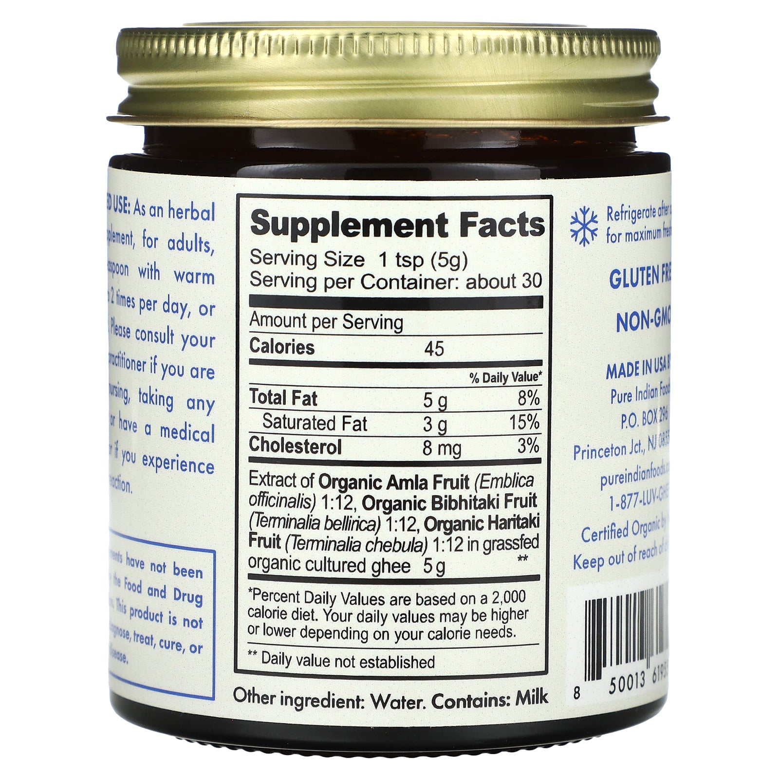 | Extract of Organic Amla fruit (Emblica officinalis) 1:12, Organic Bibhitaki Fruit (Terminalia bellirica) 1:12, Organic Haritaki Fruit (Terminalia Chebula) 1:12 in grassfed organic cultured ghee | 5 g | ** |
