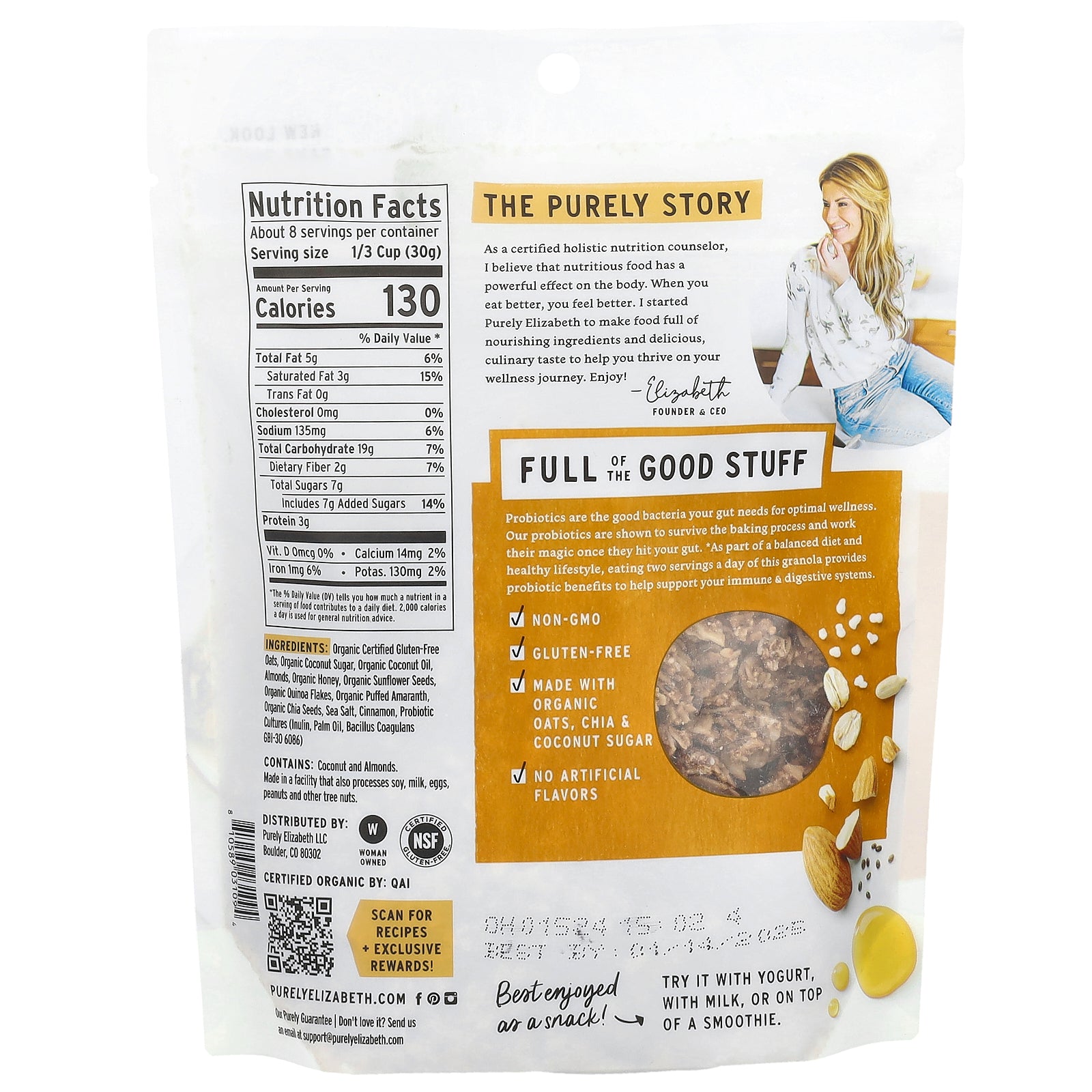 Organic certified gluten-free oats, organic coconut sugar, organic coconut oil, almonds, organic honey, organic sunflower seeds, organic quinoa flakes, organic puffed amaranth, organic chia seeds, sea salt, cinnamon, probiotic cultures (inulin, palm oil, bacillus coagulans GBI-30 6086)