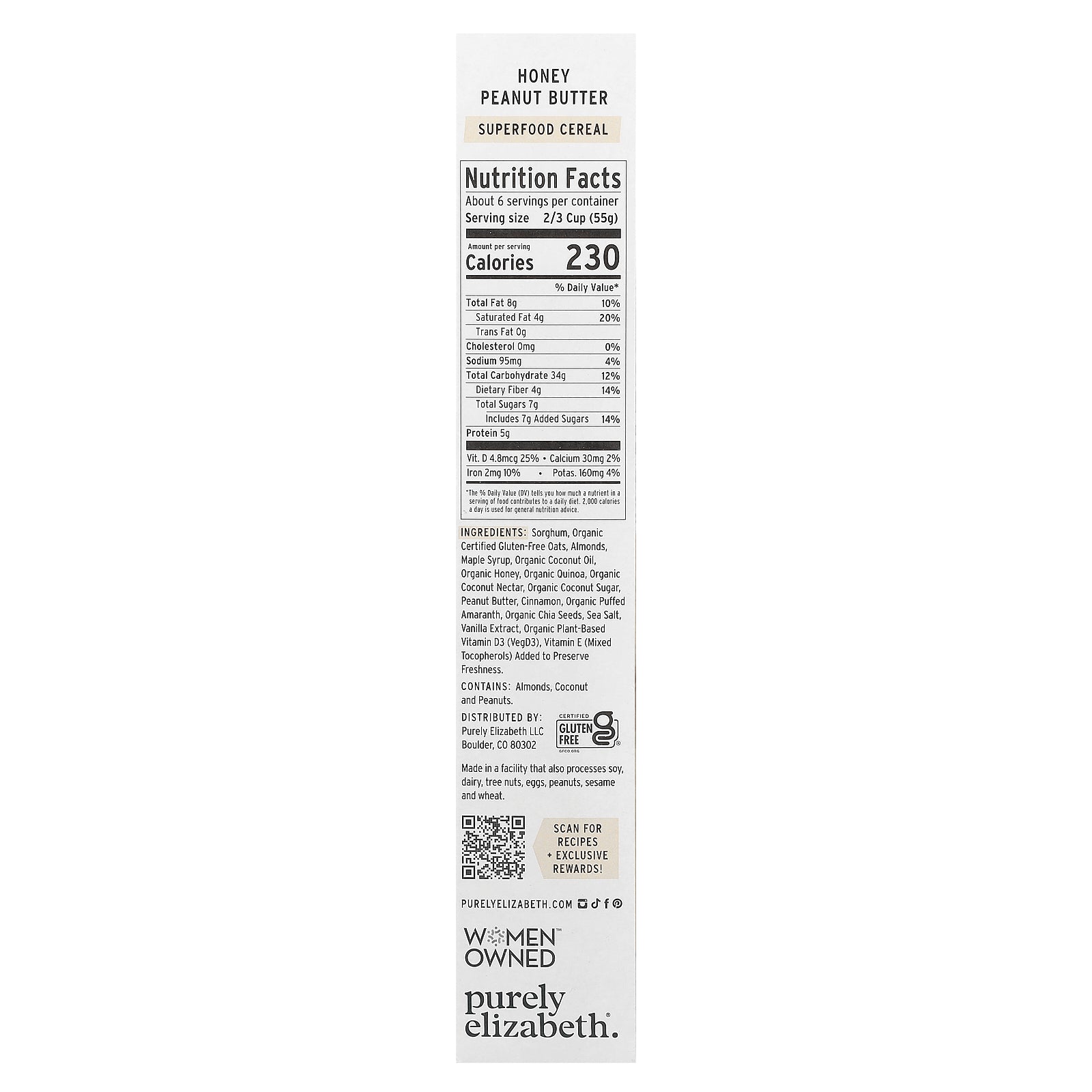Sorghum, organic certified gluten-free oats, almonds, maple syrup, organic coconut oil, organic honey, organic quinoa, organic coconut nectar, organic coconut sugar, peanut butter, cinnamon, organic puffed amaranth, organic chia seeds, sea salt, vanilla extract, organic plant-based vitamin d3 (vegd3), vitamin e (mixed tocopherols) added to preserve freshness.