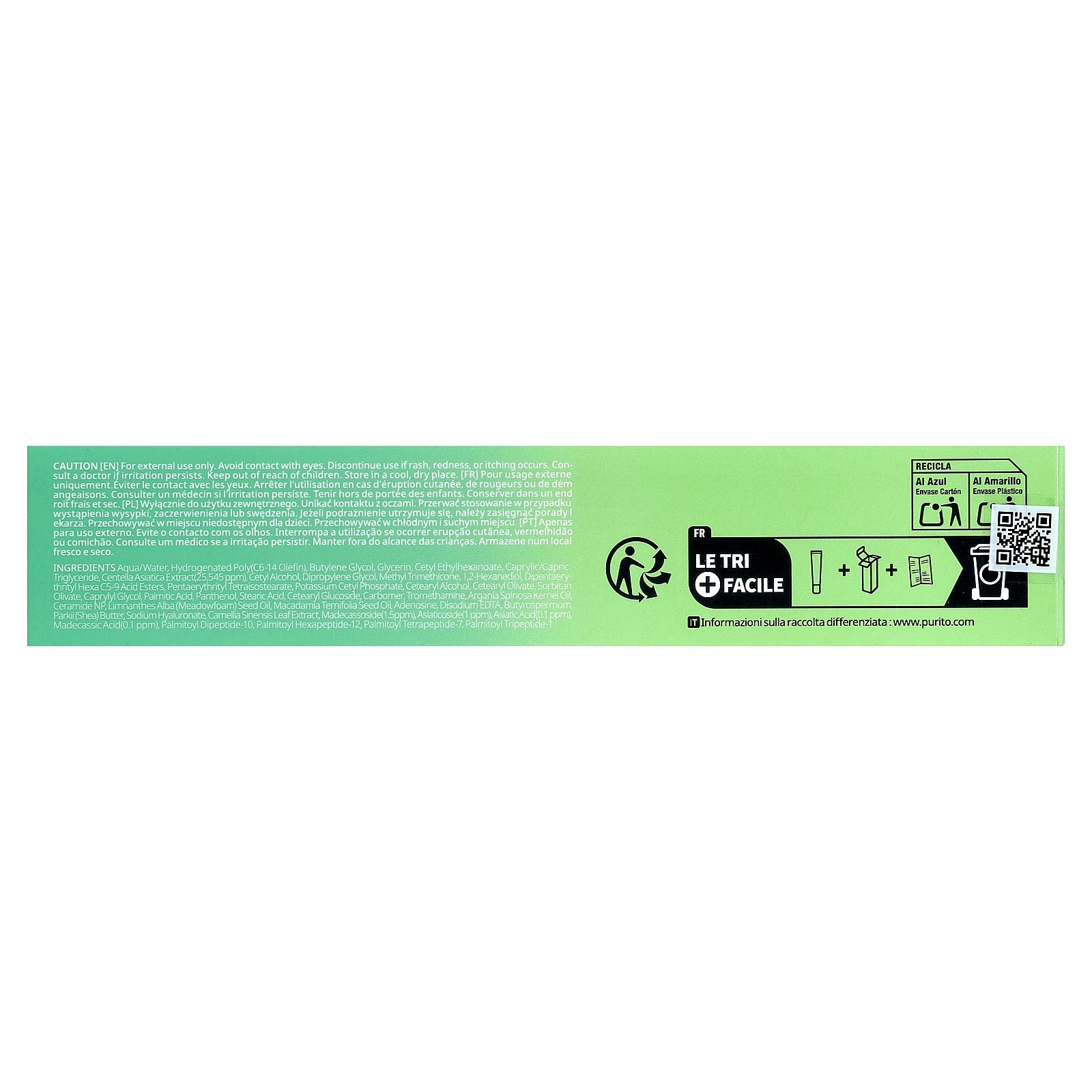 Water, hydrogenated poly (c6-14 olefin), butylene glycol, glycerin, cetyl ethylhexanoate, caprylic/capric triglyceride, centella asiatica extract (25,545 ppm), cetyl alcohol, dipropylene glycol, methyl trimethicone, 1,2-hexanediol, dipentaerythrityl hexa c5-9 acid esters, pentaerythrityl tetraisostearate, potassium cetyl phosphate, cetearyl alcohol, cetearyl olivate, sorbitan olivate, caprylyl glycol, palmitic acid, panthenol, stearic acid, cetearyl glucoside, carbomer, tromethamine, argania spinosa kernel oil, ceramide np, limnanthes alba (meadowfoam) seed oil, macadamia ternifolia seed oil, adenosine, disodium edta, butyrospermum parkii (shea) butter, sodium hyaluronate, camellia sinensis leaf extract, madecassoside (1.5 ppm), asiaticoside (1 ppm), asiatic acid (0.1 ppm) madecassic acid (0.1 ppm), palmitoyl dipeptide-10, palmitoyl hexapeptide-12, palmitoyl tetrapeptide-7, palmitoyl tripeptide-1.