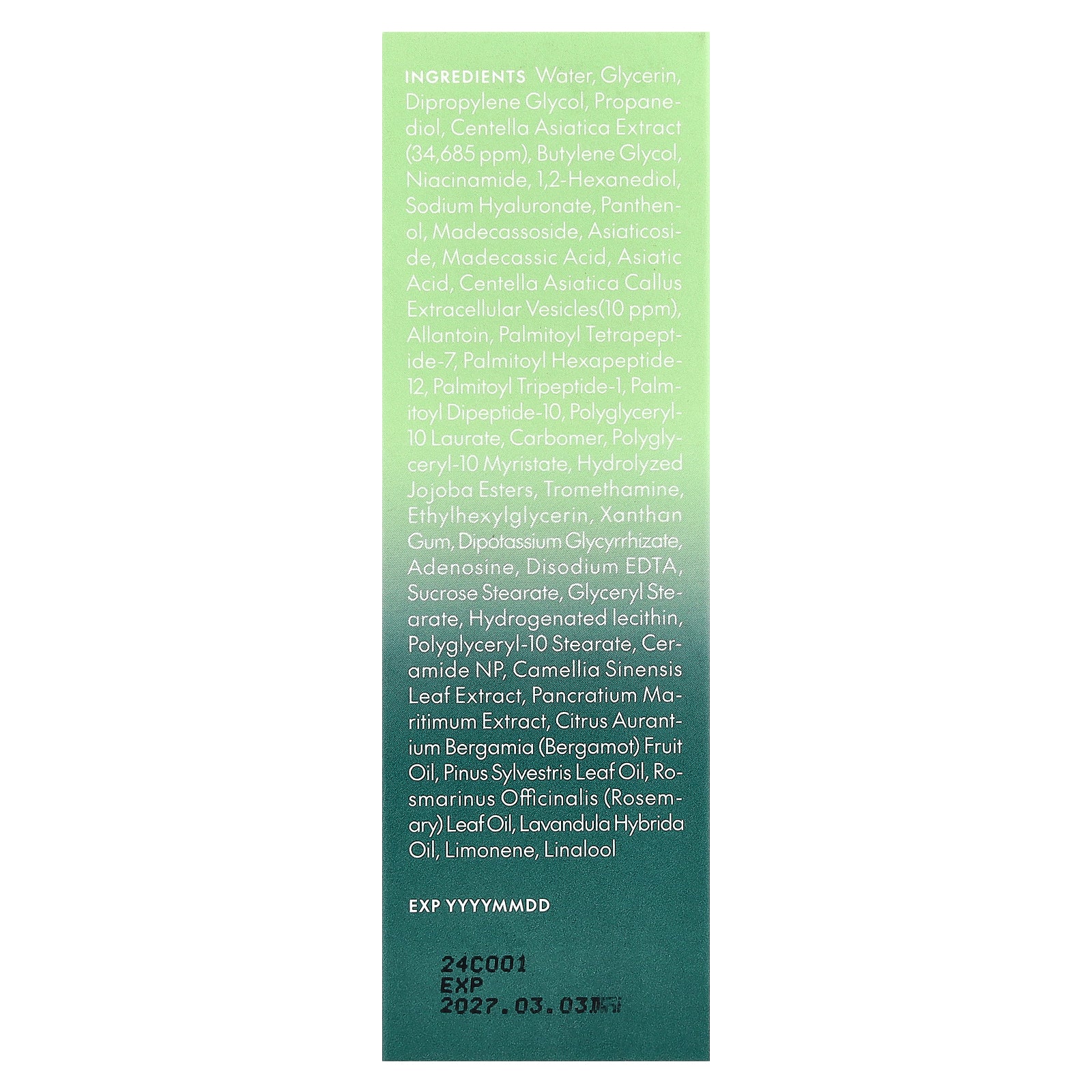 Water, glycerin, dipropylene glycol, propanediol, centella asiatica extract (34,685 ppm), butylene glycol, niacinamide, 1,2-hexanediol, sodium hyaluronate, panthenol, madecassoside, asiaticoside, madecassic acid, asiatic acid, centella asiatica callus extracellular vesicles(10 ppm). allantoin, palmitoyl tetrapeptide-7, palmitoyl hexapeptide- 12, palmitoyl tripeptide-1, palmitoyl dipeptide-10, polyglyceryl- 10 laurate, carbomer, polyglyceryl-10 myristate, hydrolyzed jojoba esters, tromethamine ethylhexylglycerin, xanthan gum, dipotassium glycyrrhizate, adenosine, disodium edta, sucrose stearate, glyceryl stearate, hydrogenated lecithin, polyglyceryl-10 stearate, ceramide np, camellia sinensis leaf extract, pancratium maritimum extract, citrus aurantium bergamia (bergamot) fruit oil, pinus sylvestris leaf oil, rosmarinus officinalis (rosemary) leaf oil, lavandula hybrida oil, limonene, linalool.