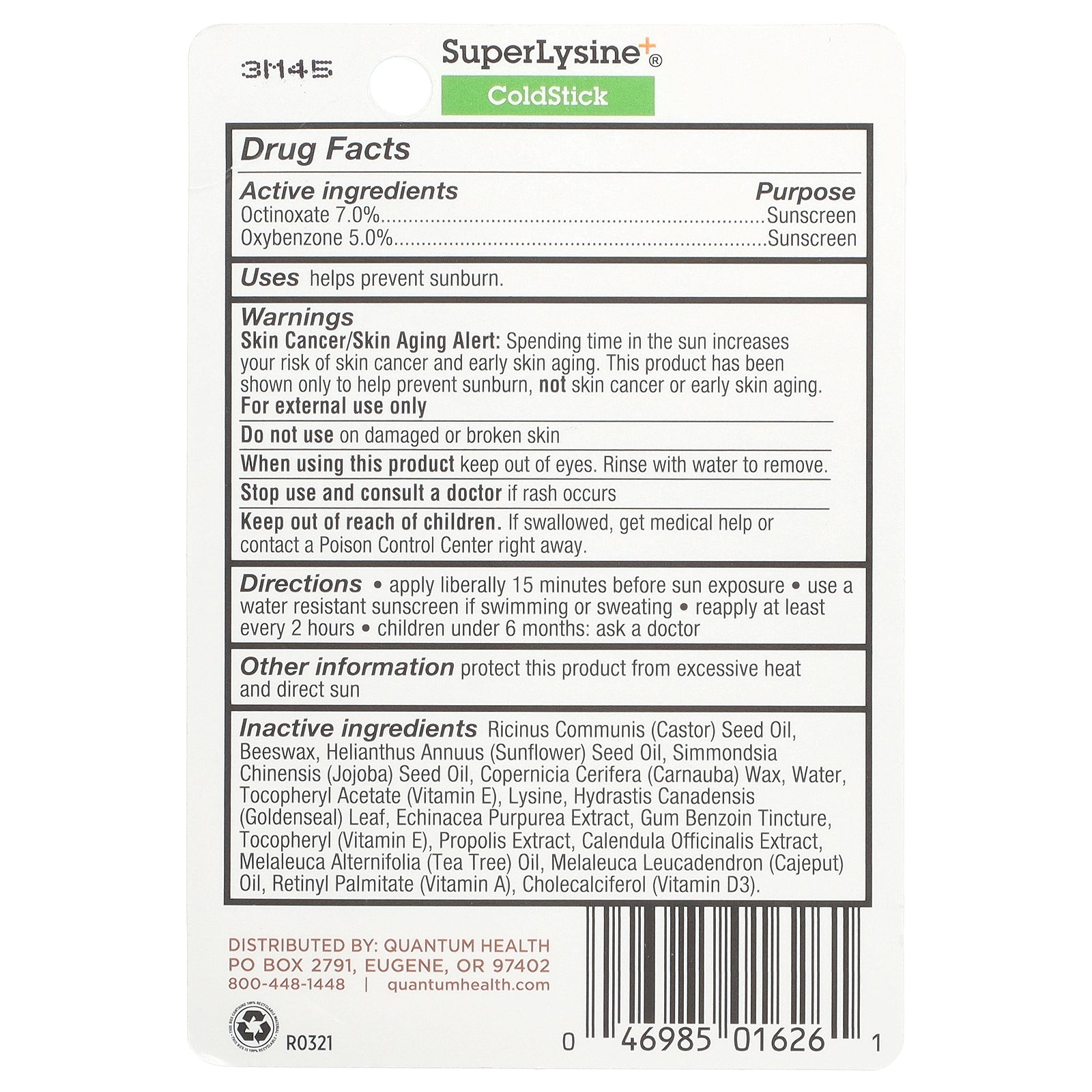 | Ricinus communis (castor) seed oil, beeswax, helianthus annuus (sunflower) seed oil, simmondsia chinensis (jojoba) seed oil, copernicia cerifera (carnauba) wax, water, tocopheryl acetate (vitamin e), lysine, hydrastis canadensis (goldenseal) leaf, echinacea purpurea extract, gum benzoin tincture, tocopheryl (vitamin e), propolis extract, calendula officinalis extract, melaleuca alternifolia (tea tree) oil, melaleuca leucadendron (cajeput) oil, retinyl palmitate (vitamin a), cholecalciferol (vitamin d3). |