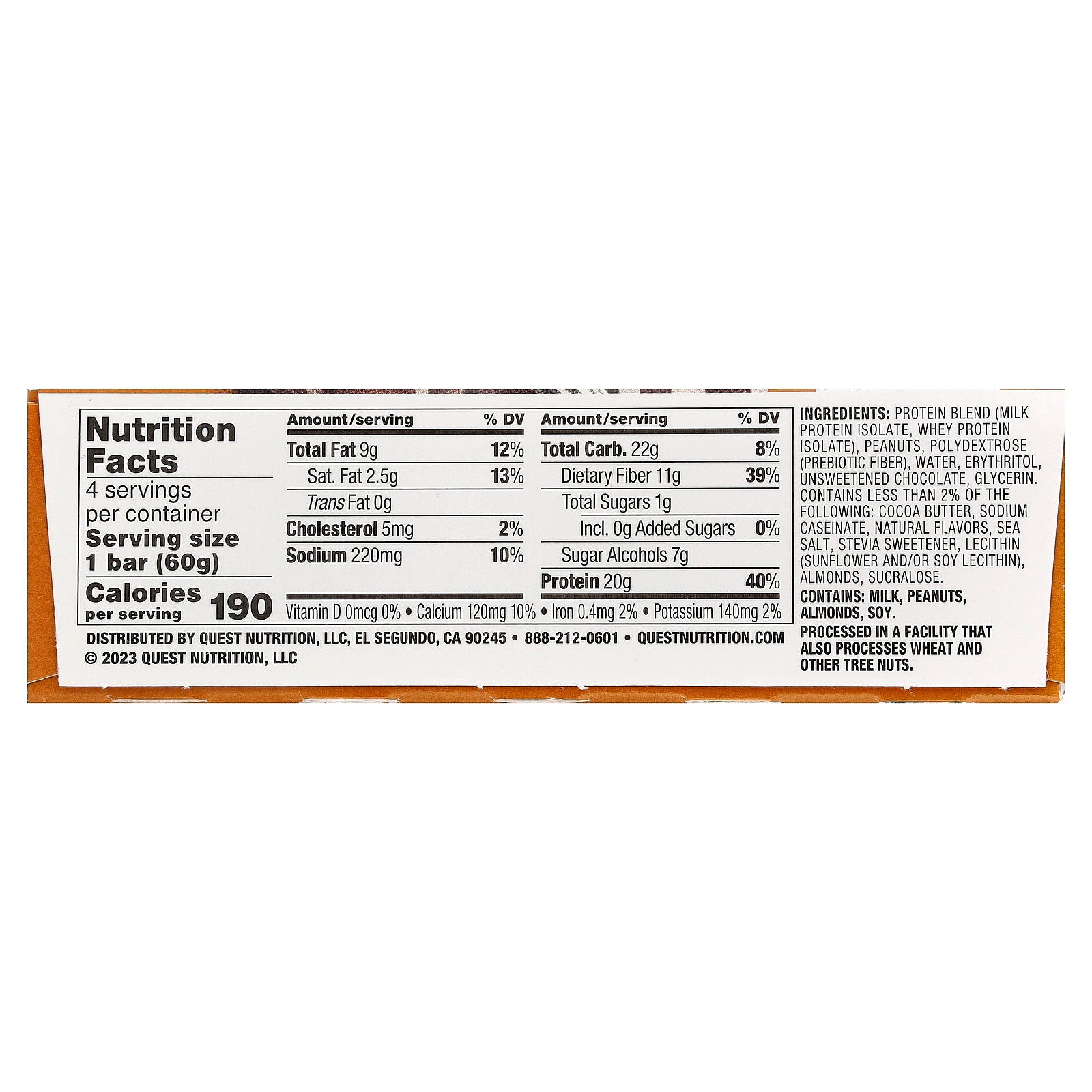 Protein blend (milk protein isolate, whey protein isolate), peanuts, polydextrose (prebiotic fiber), water, erythritol, unsweetened chocolate, glycerin. Contains less than 2% of the following: cocoa butter, sodium caseinate, natural flavors, sea salt, stevia sweetener, lecithin (sunflower and/or soy lecithin), almonds, sucralose.