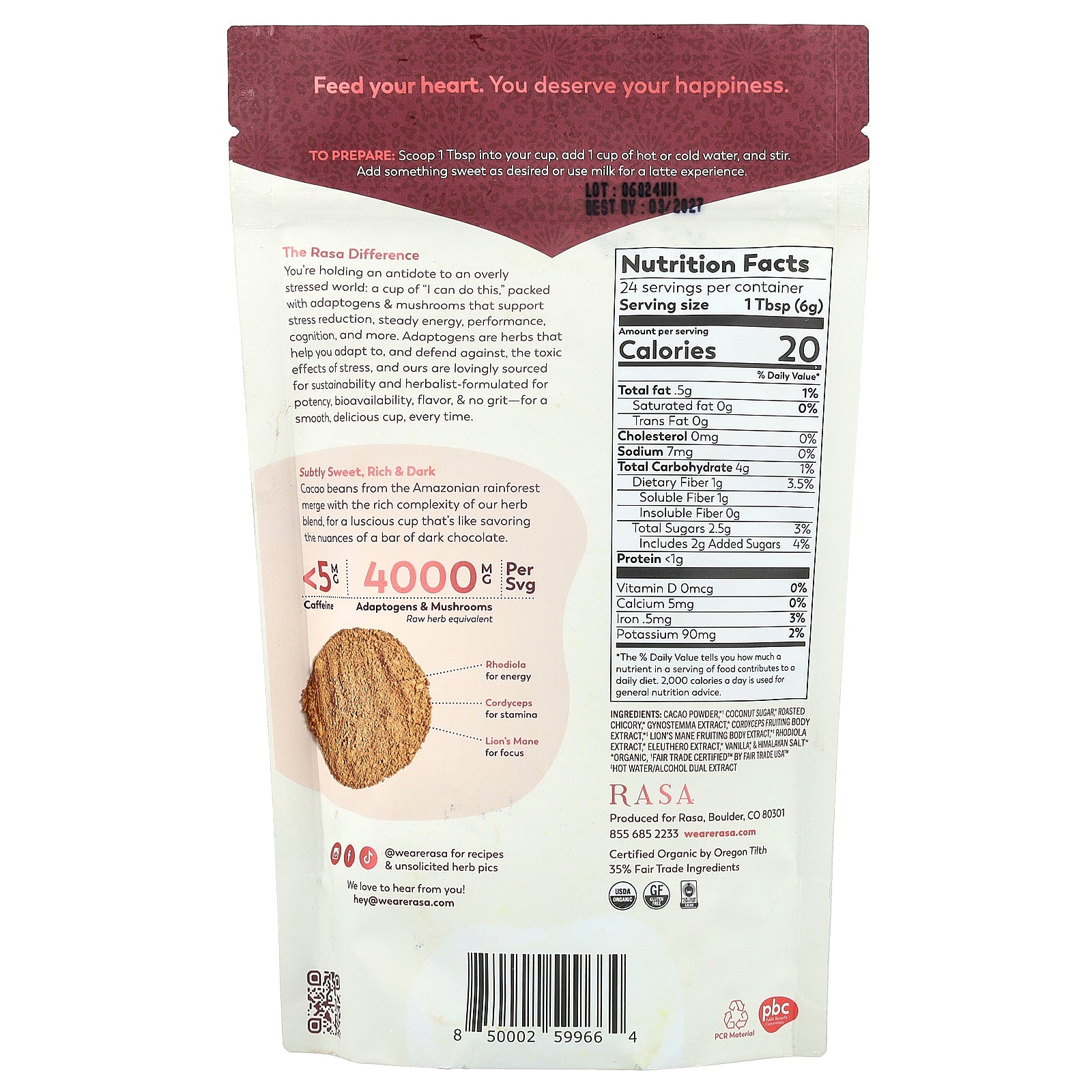 Cacao powder*†, coconut sugar*, roasted chicory, gynostemma extract*, cordyceps fruiting body extract*‡, lion's mane fruiting body extract*‡, rhodiola extract*, eleuthero extract*, vanilla*, & Himalayan salt*.