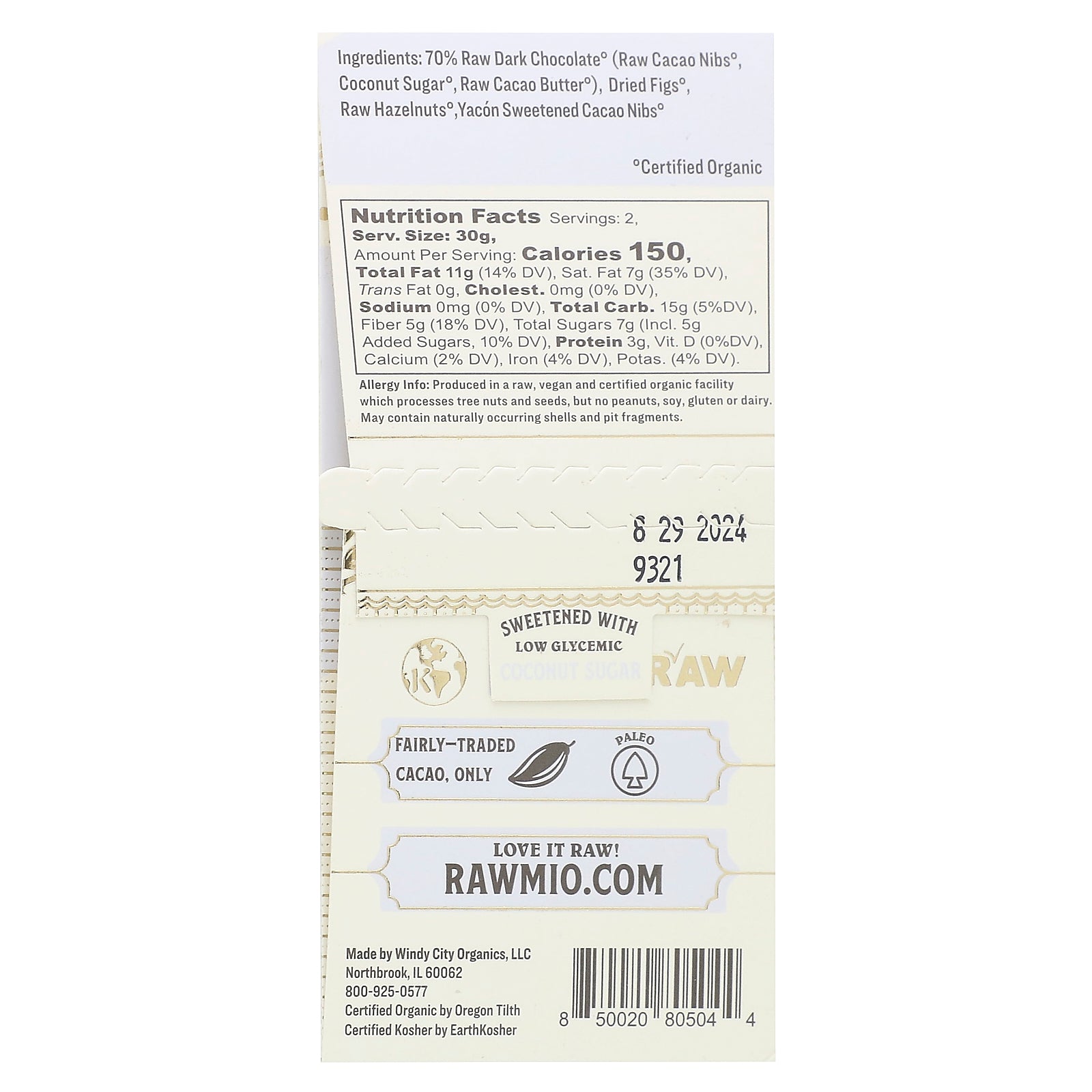 70% Raw dark chocolateº (raw cacao nibsº, coconut sugarº, raw cacao butterº), dried figsº raw hazelnutsº, yacon sweetened cacao nibsº.