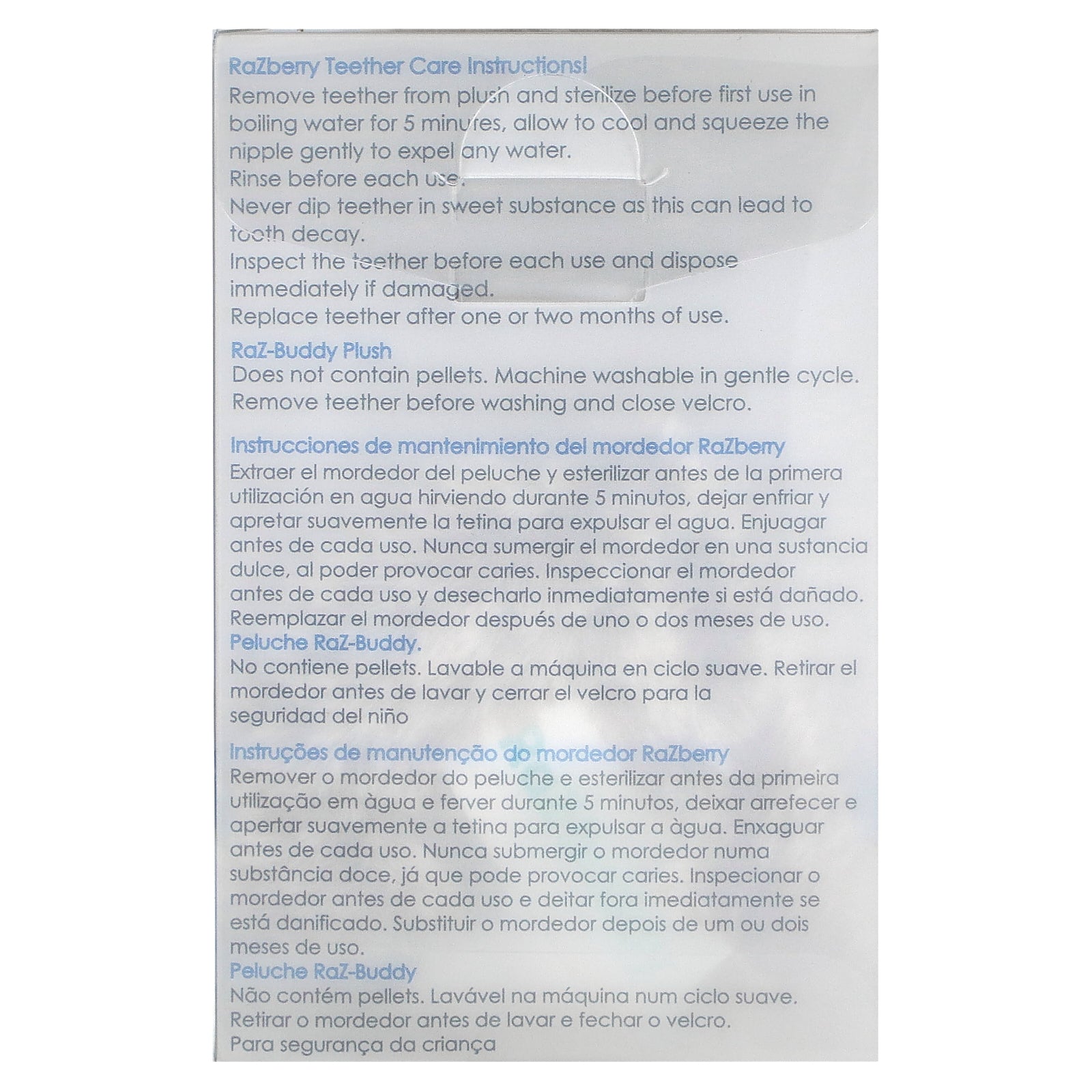 Remove teether from plush and sterilize before first use in boiling water for 5 minutes, allow to cool and squeeze the nipple gently to expel any water. Rinse before each use. Never dip teether in sweet substance as this can lead to tooth decay. Inspect the teether before each use and dispose immediately if damaged. Replace teether after one or two months of use.