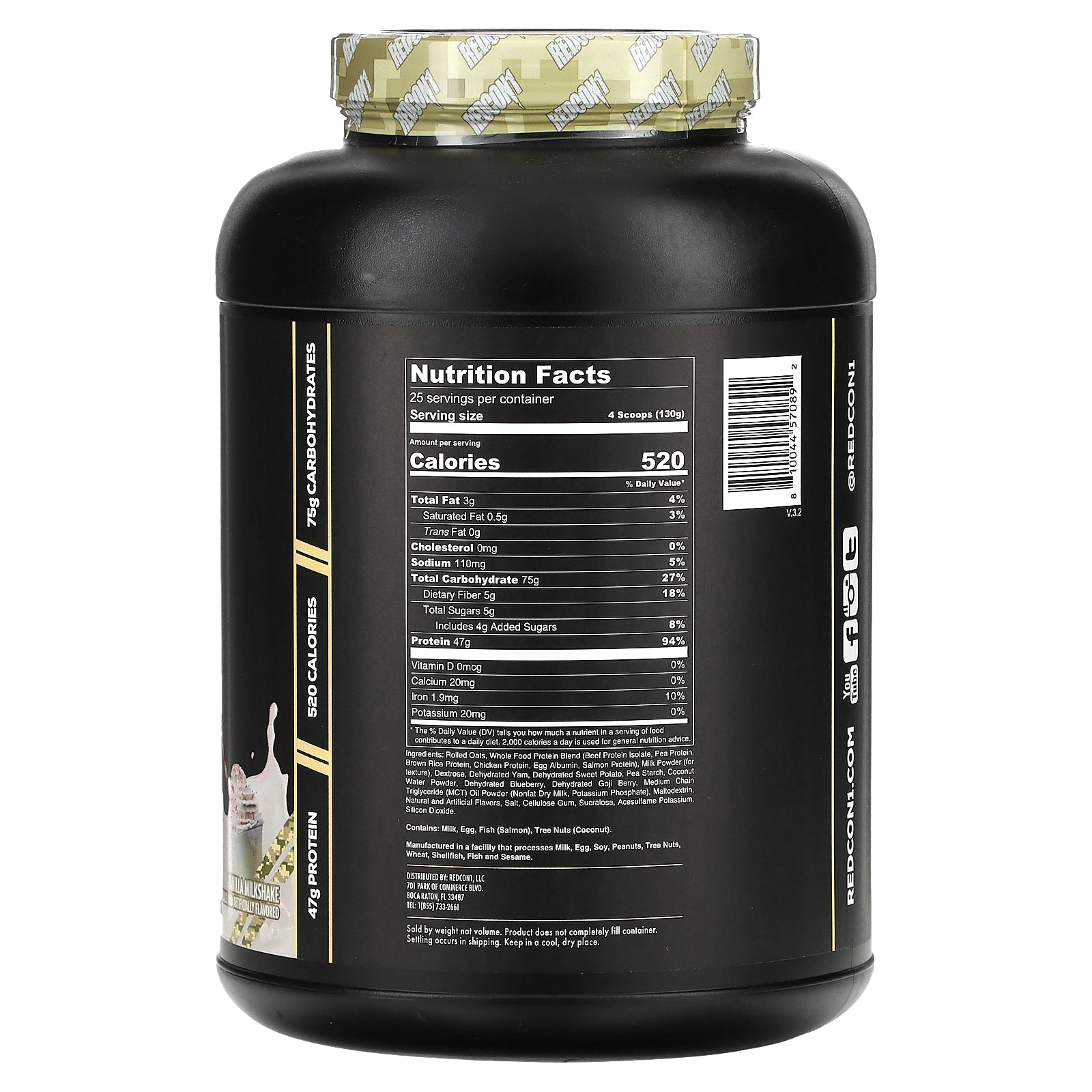 Rolled oats, whole food protein blend (beef protein isolate, pea protein, brown rice protein, chicken protein, egg albumin, salmon protein), milk powder (for texture), dextrose, dehydrated yam, dehydrated sweet potato, pea starch, coconut water powder, dehydrated blueberry, dehydrated goji berry, medium chain triglyceride (mct) oil powder (nonfat dry milk, potassium phosphate), maltodextrin, natural and artificial flavors, salt, cellulose gum, sucralose, acesulfame potassium, silicon dioxide.