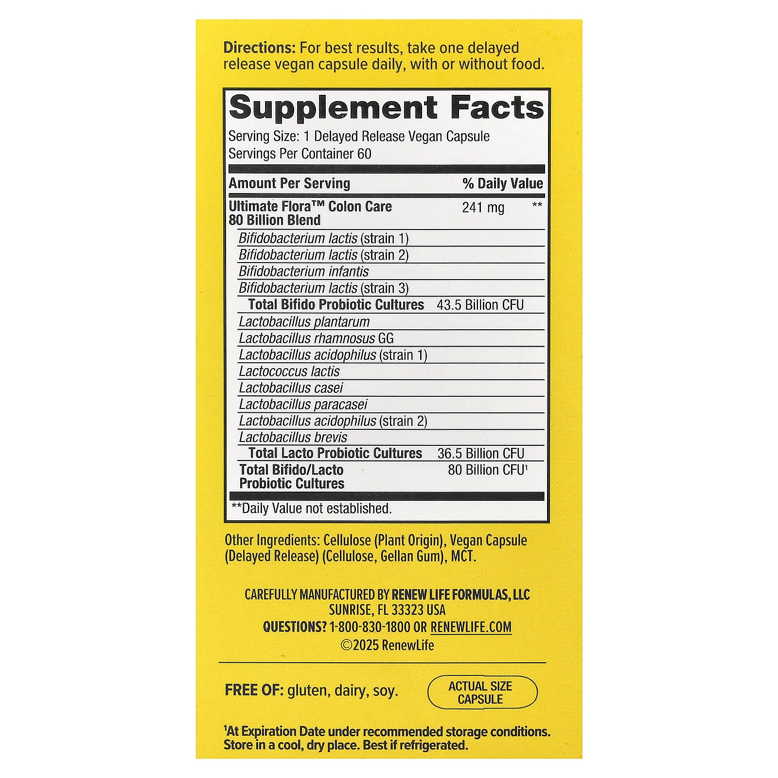 Colon Care Probiotic to Support Colon Health* Ultimate Flora™ 80 Billion Colon Care Probiotic is an extra strength formula with 12 specially selected strains designed to re-establish digestive balance, help relieve occasional constipation, and support digestive health. It contains more Bifidobacteria than Lactobacilli to help provide more beneficial bacteria in the colon.