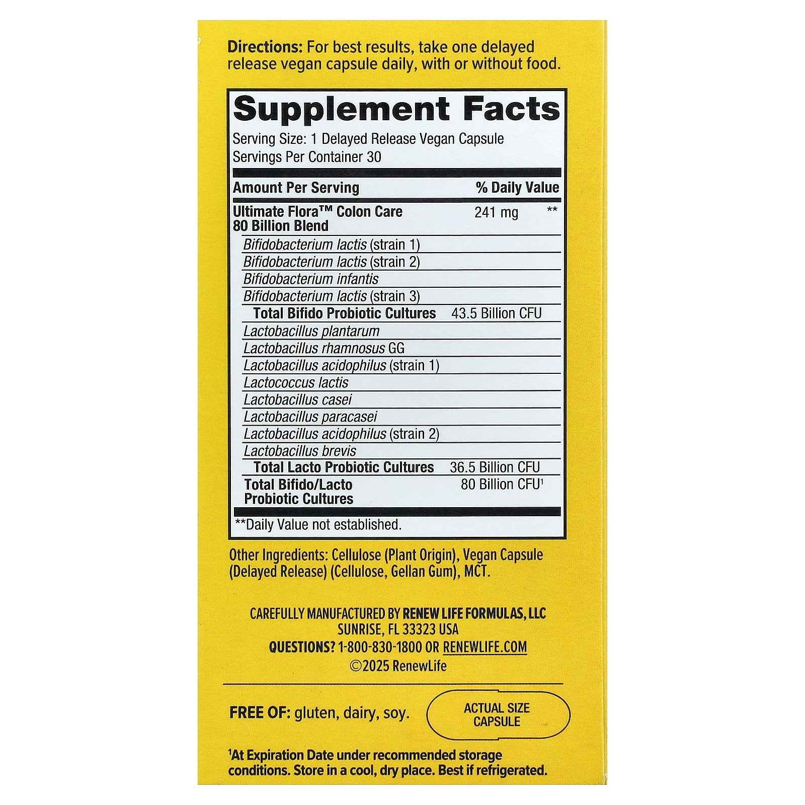 Ultimate Flora™ 80 Billion Colon Care Probiotic is an extra strength formula with 12 specially selected strains designed to re-establish digestive balance, help relieve occasional constipation, and support digestive health. It contains more Bifidobacteria than Lactobacilli to help provide more beneficial bacteria in the colon.