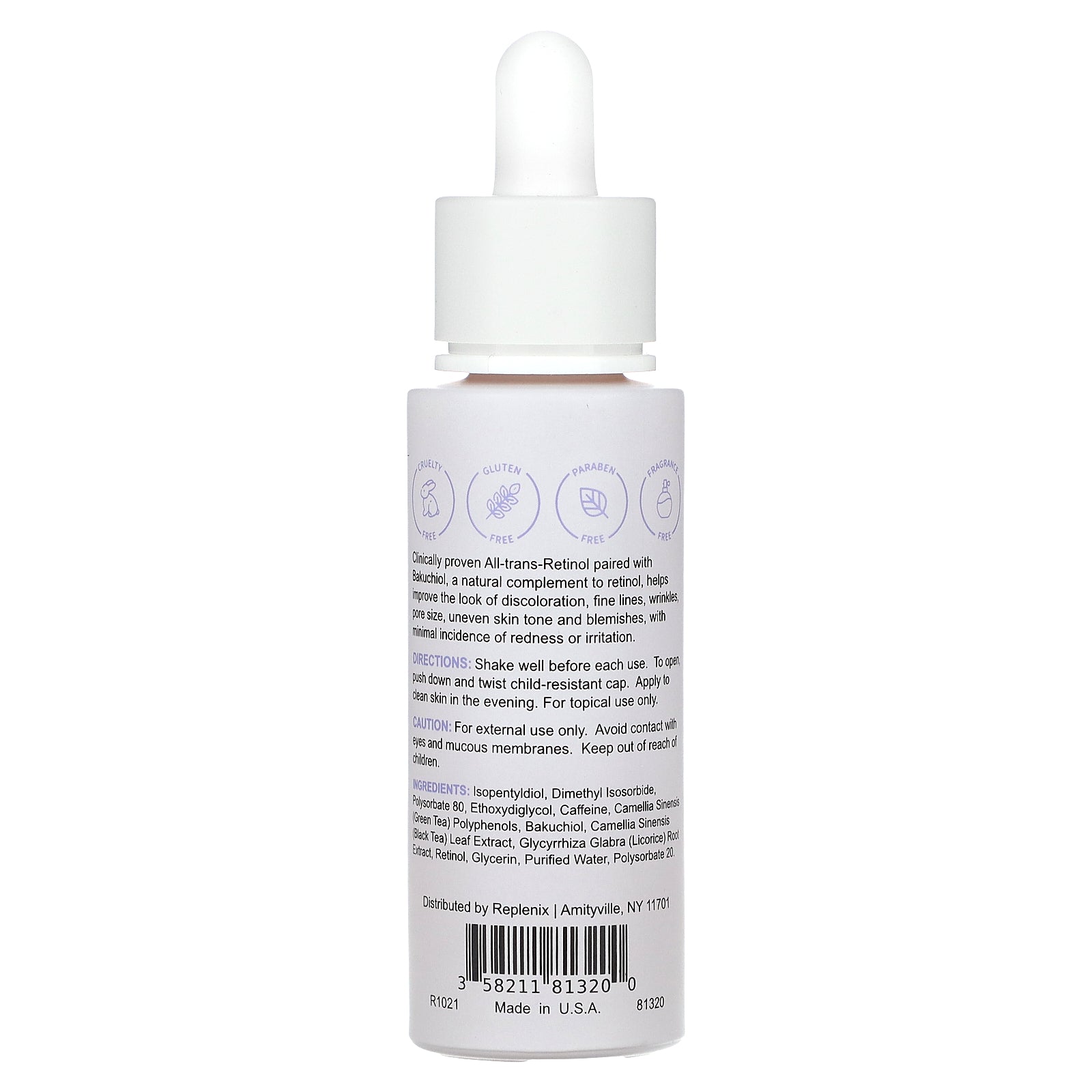 Clinically proven All-trans-Retinol paired with Bakuchiol, a natural complement to retinol, helps improve the look of discoloration, fine lines, wrinkles, pore size, uneven skin tone and blemishes, with minimal incidence of redness or irritation.