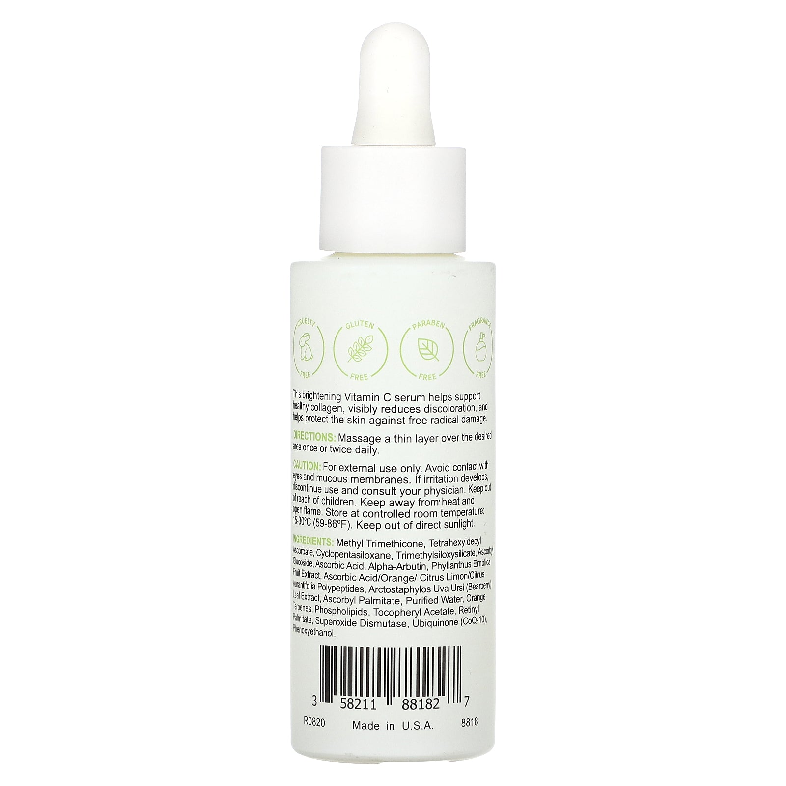 Methyl trimethicone, tetrahexyldecyl ascorbate, cyclopentasiloxane, trimethylsiloxysilicate, ascorbyl glucoside, ascorbic acid, alpha-arbutin, phyllanthus emblica fruit extract, ascorbic acid/orange/ citrus limon/citrus aurantifolia polypeptides, arctostaphylos uva ursi (bearberry) leaf extract, ascorbyl palmitate, purified water, orange terpenes, phospholipids, tocopheryl acetate, retinyl palmitate, superoxide dismutase, ubiquinone (coq-10), phenoxyethanol.