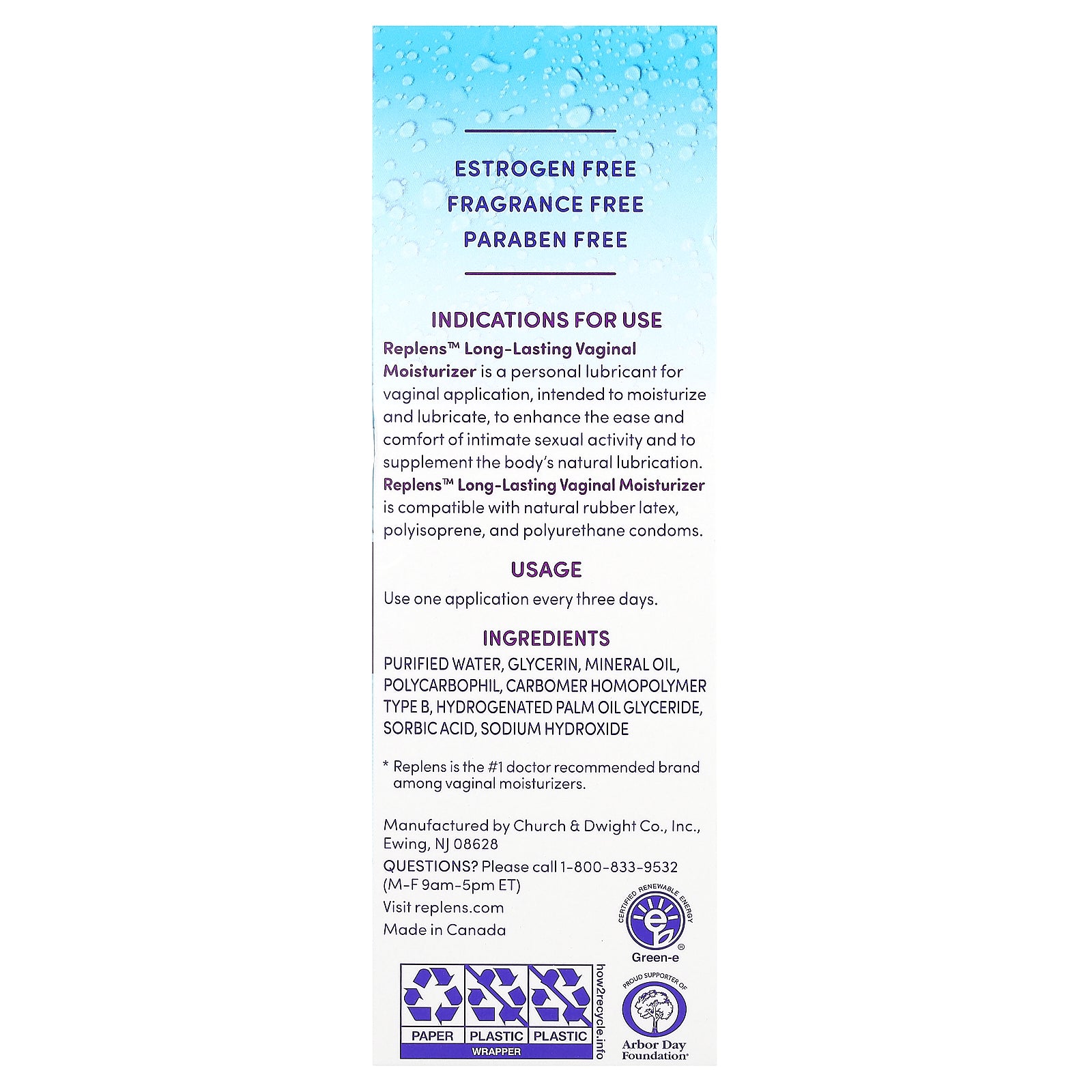 Replens™ Long-Lasting Vaginal Moisturizer is not a contraceptive and does not contain a spermicide. Keep out of eyes and ears. If vaginal irritation occurs, discontinue use or contact your physician. If pregnant or breastfeeding, contact your health care provider before use.