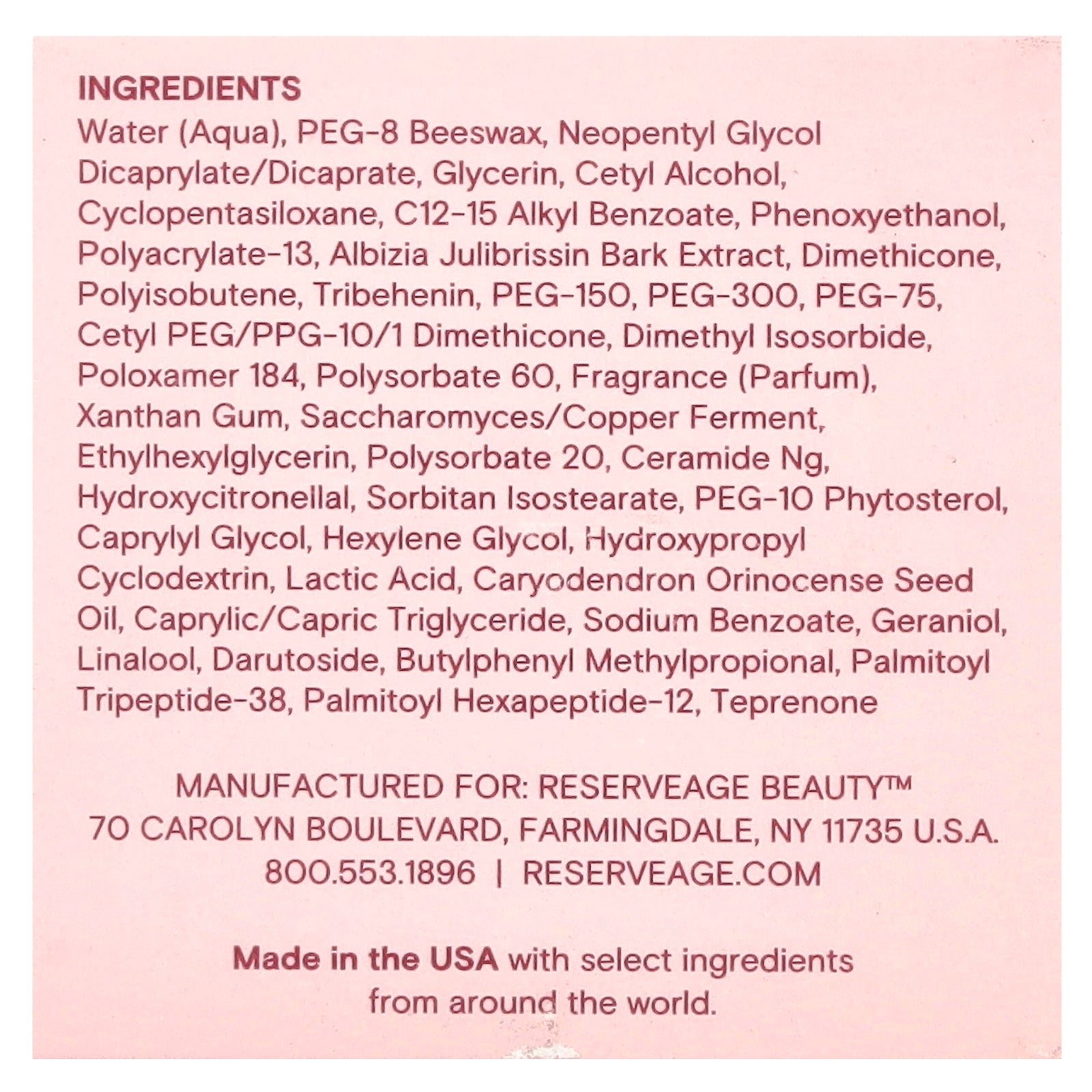 Water (aqua), peg-8 beeswax, neopentyl glycol dicaprylate/dicaprate, glycerin, cetyl alcohol, cyclopentasiloxane, c12-15 alkyl benzoate, phenoxyethanol, polyacrylate-13, albizia julibrissin bark extract, dimethicone, polyisobutene, tribehenin, peg-150, peg-300, peg-75, cetyl peg/ppg-10/1 dimethicone, dimethyl isosorbide, poloxamer 184, polysorbate 60, fragrance (parfum), xanthan gum, saccharomyces/copper ferment, ethylhexylglycerin, polysorbate 20, ceramide ng, hydroxycitronellal, sorbitan isostearate, peg-10 phytosterol, caprylyl glycol, hexylene glycol, hydroxypropyl cyclodextrin, lactic acid, caryodendron orinocense seed oil, caprylic/capric triglyceride, sodium benzoate, geraniol, linalool, darutoside, butylphenyl methylpropional, palmitoyl tripeptide-38, palmitoyl hexapeptide-12, teprenone.