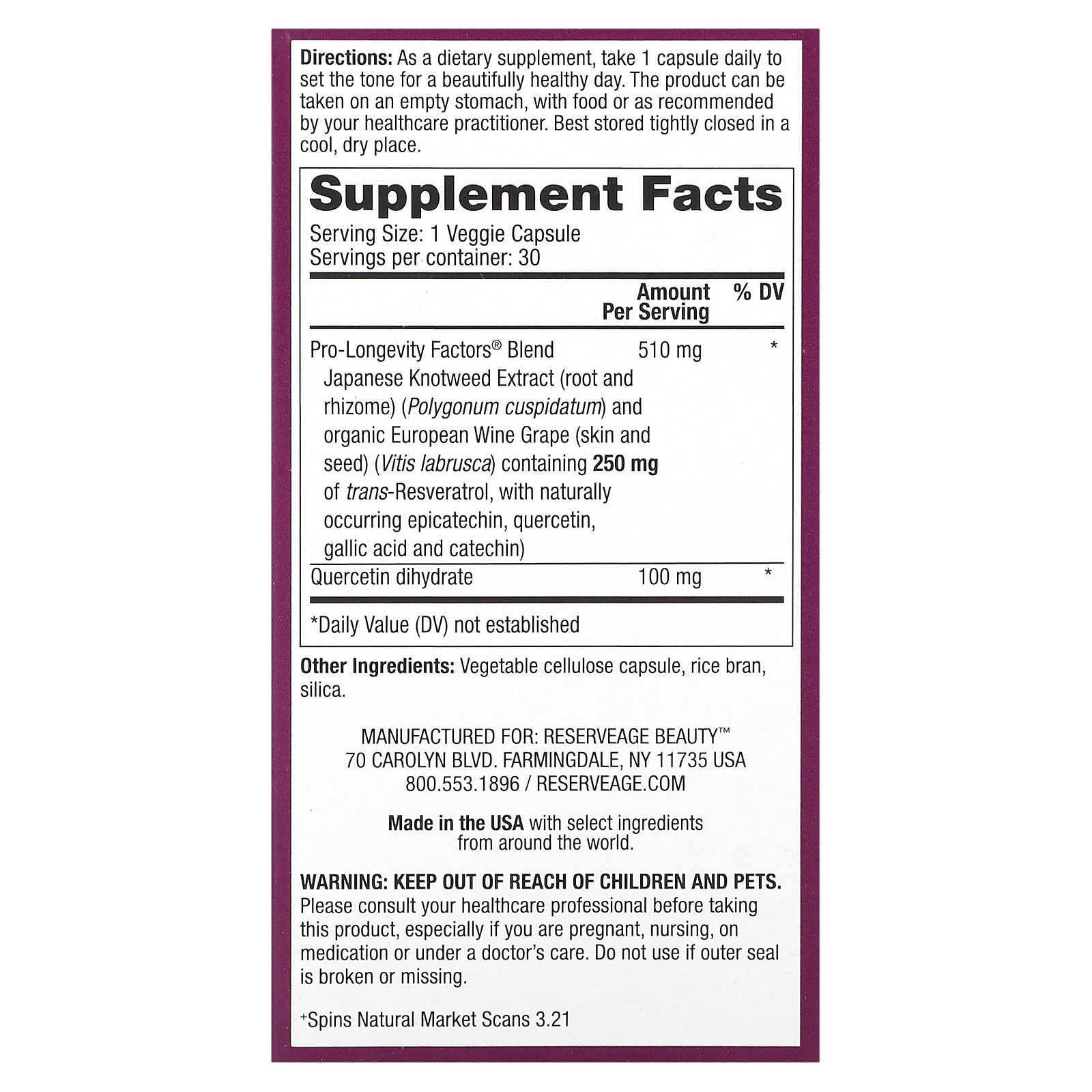| Pro-Longevity Factors® Blend Japanese Knotweed Extract (root and rhizome) (Polygonum cuspidatum) and organic European Wine Grape (skin and seed) (Vitis labrusca) containing 250 mg of trans-Resveratrol, with naturally occurring epicatechin, quercetin, gallic acid and catechin) |