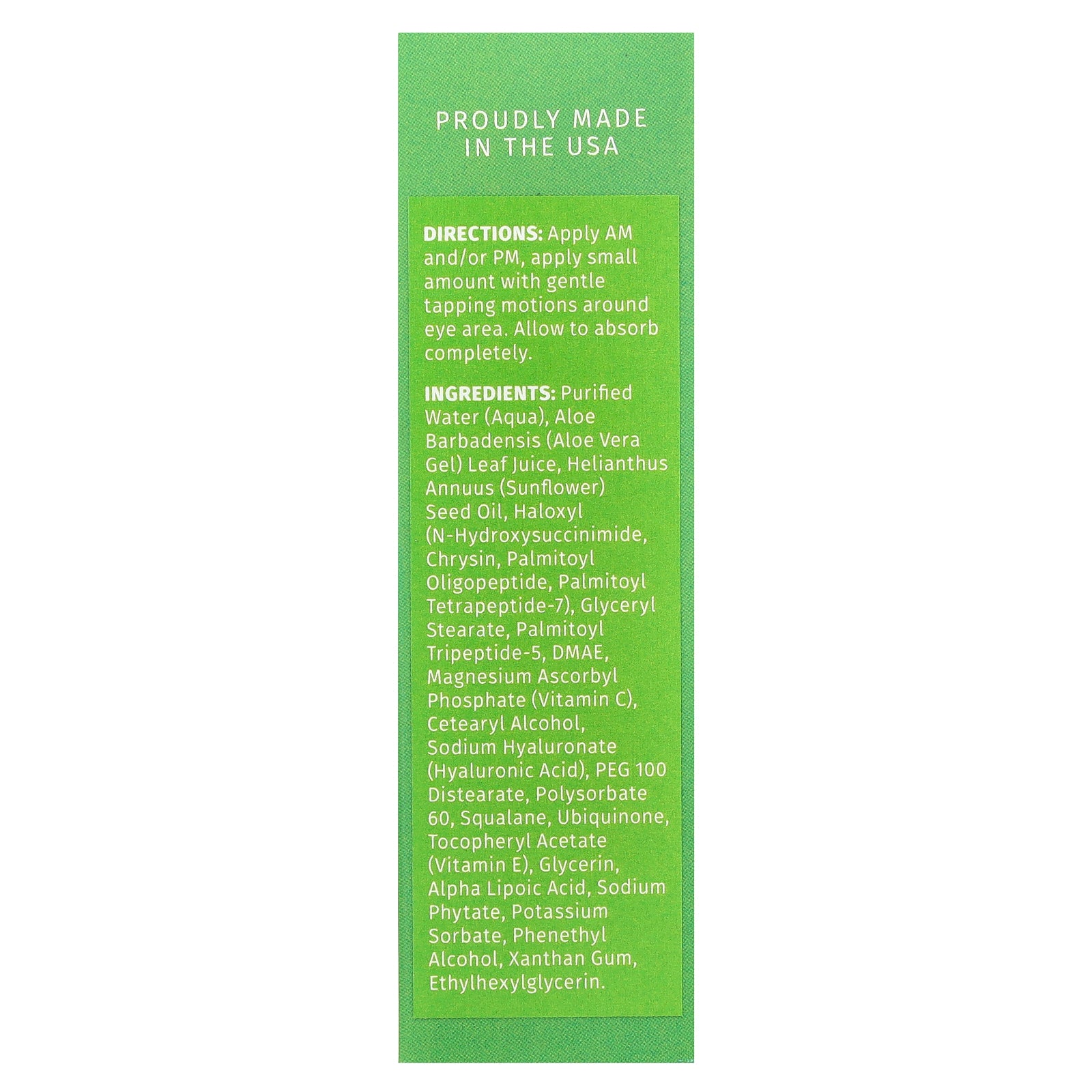 Purified water (aqua), aloe barbadensis (aloe vera gel) leaf juice, helianthus annuus (sunflower) seed oil, haloxyl (n-hydroxysuccinimide, chrysin, palmitoyl oligopeptide, palmitoyl tetrapeptide-7), glyceryl stearate, palmitoyl tripeptide-5, dmae magnesium ascorbyl phosphate (vitamin c), cetearyl alcohol, sodium hyaluronate (hyaluronic acid), peg 100 distearate, polysorbate 60, squalane, ubiquinone, tocopheryl acetate (vitamin e), glycerin, alpha lipoic acid, sodium phytate, potassium sorbate, phenethyl alcohol, xanthan gum, ethylhexylglycerin.