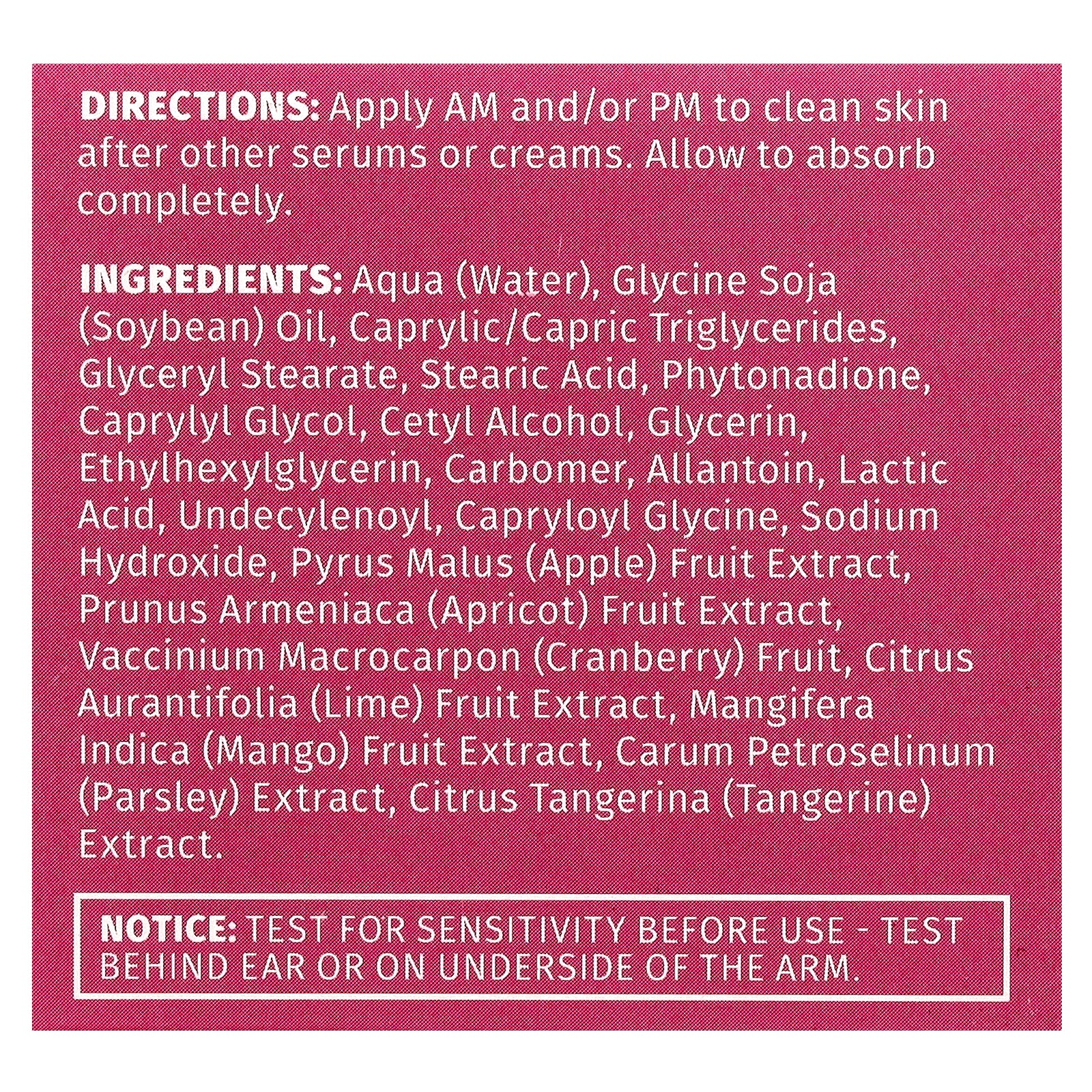 Water, glycine soja (soybean) oil, caprylic/capric triglycerides, glyceryl stearate, stearic acid, phytonadione (vitamin k), caprylyl glycol, cetyl alcohol, glycerin, ethylhexylglycerin, carbomer, allantoin, lactic acid, undecylenoyl, capryloyl glycine, sodium hydroxide, pyrus malus (apple) fruit extract, prunus armeniaca (apricot) fruit extract, vaccinium macrocarpon (cranberry) fruit, citrus aurantifolia (lime) fruit extract, mangifera indica (mango) fruit extract, carum petroselinum (parsley) extract, citrus tangerina (tangerine) extract.