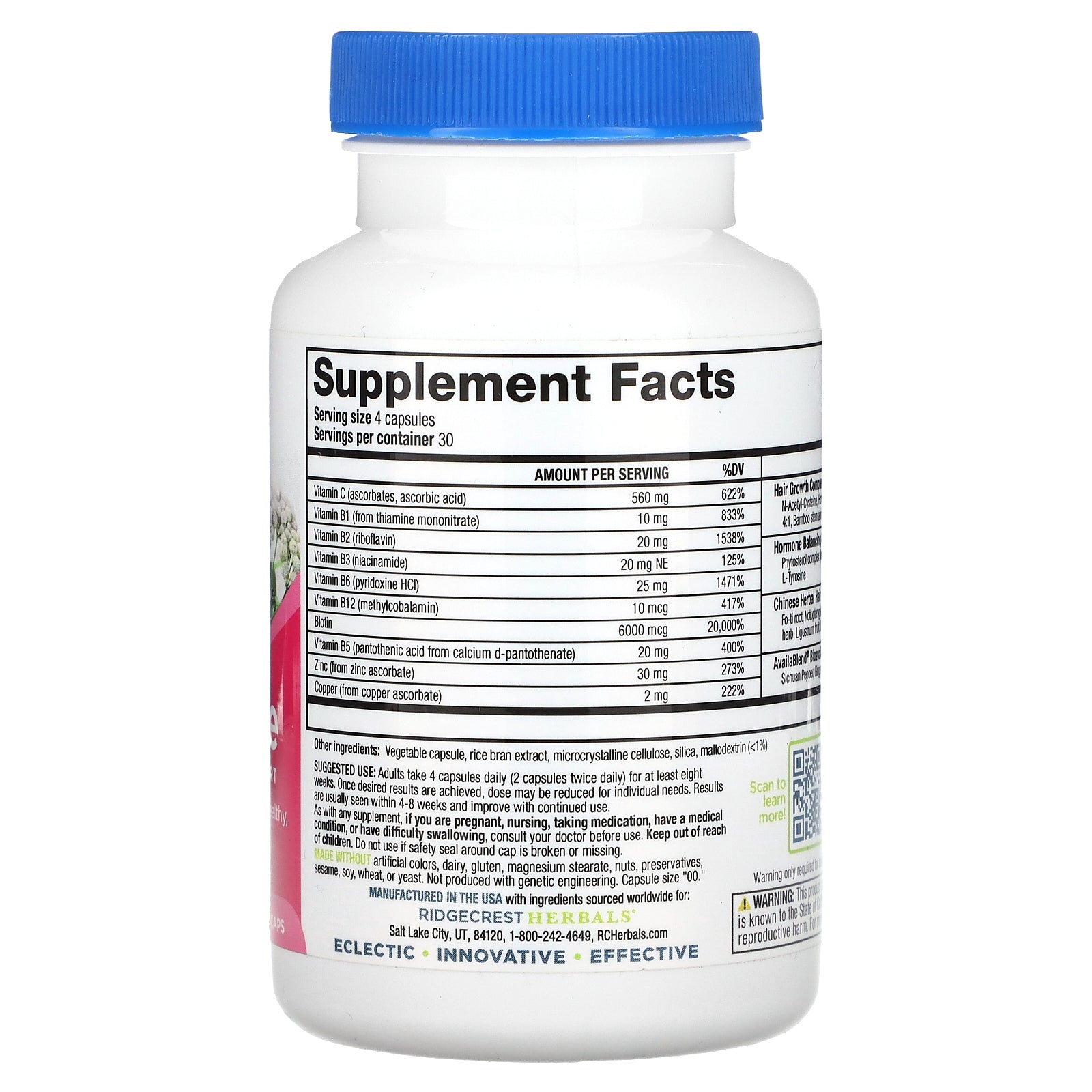 | Chinese Herbal Hair Complex (47.5 mg/cap): Fo-ti root, notopterygium root, Rehmannia raw root, Eclipta herb, Ligustrum fruit, Chinese Peony root 4:1, Dong Quai root. |