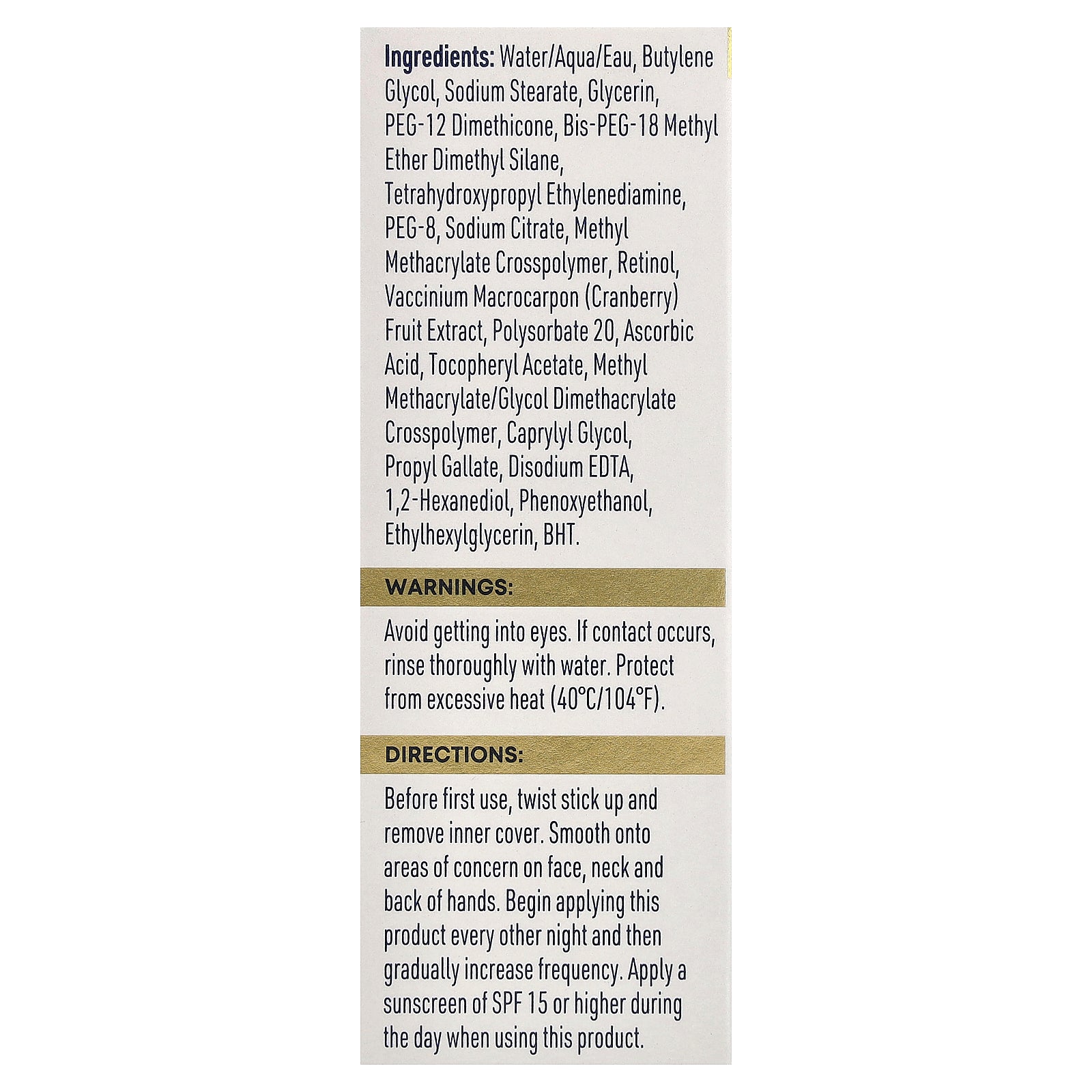 Before first use, twist stick up and remove inner cover. Smooth onto areas of concern on face, neck and back of hands. Begin applying this product every other night and then gradually increase frequency. Apply a sunscreen of SPF 15 or higher during the day when using this product.