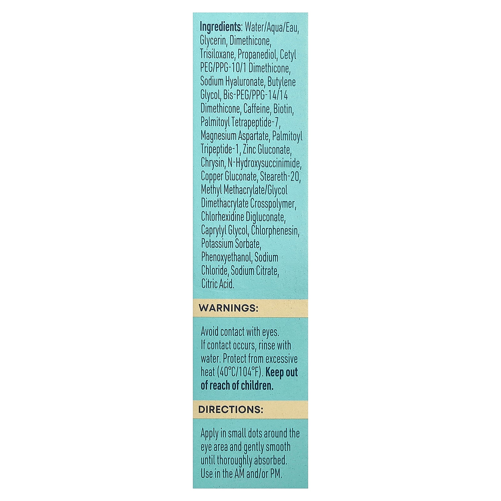 Water/aqua/eau, glycerin, dimethicone, trisiloxane, propanediol, cetyl peg/ppg-10/1 dimethicone, sodium hyaluronate, butylene glycol, bis-peg/ppg-14/14 dimethicone, caffeine, biotin, palmitoyl tetrapeptide-7, magnesium aspartate, palmitoyl tripeptide-1, zinc gluconate, chrysin, n-hydroxysuccinimide, copper gluconate, steareth-20, methyl methacrylate/glycol dimethacrylate crosspolymer, chlorhexidine digluconate, caprylyl glycol, chlorphenesin, potassium sorbate, phenoxyethanol, sodium chloride, sodium citrate, citric acid.