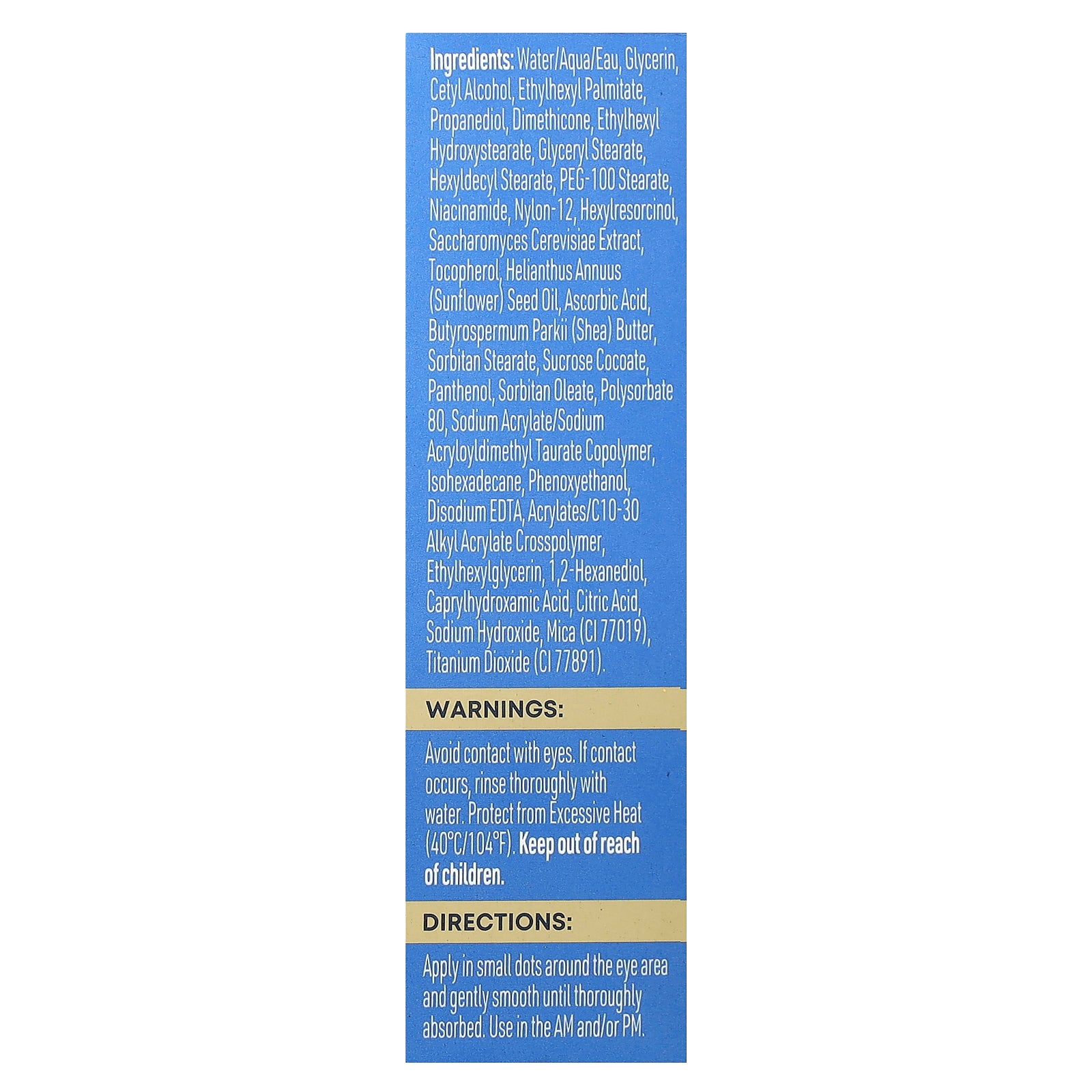 Apply in small dots around the eye area and gently smooth until thoroughly absorbed. Use in the AM and/or PM.