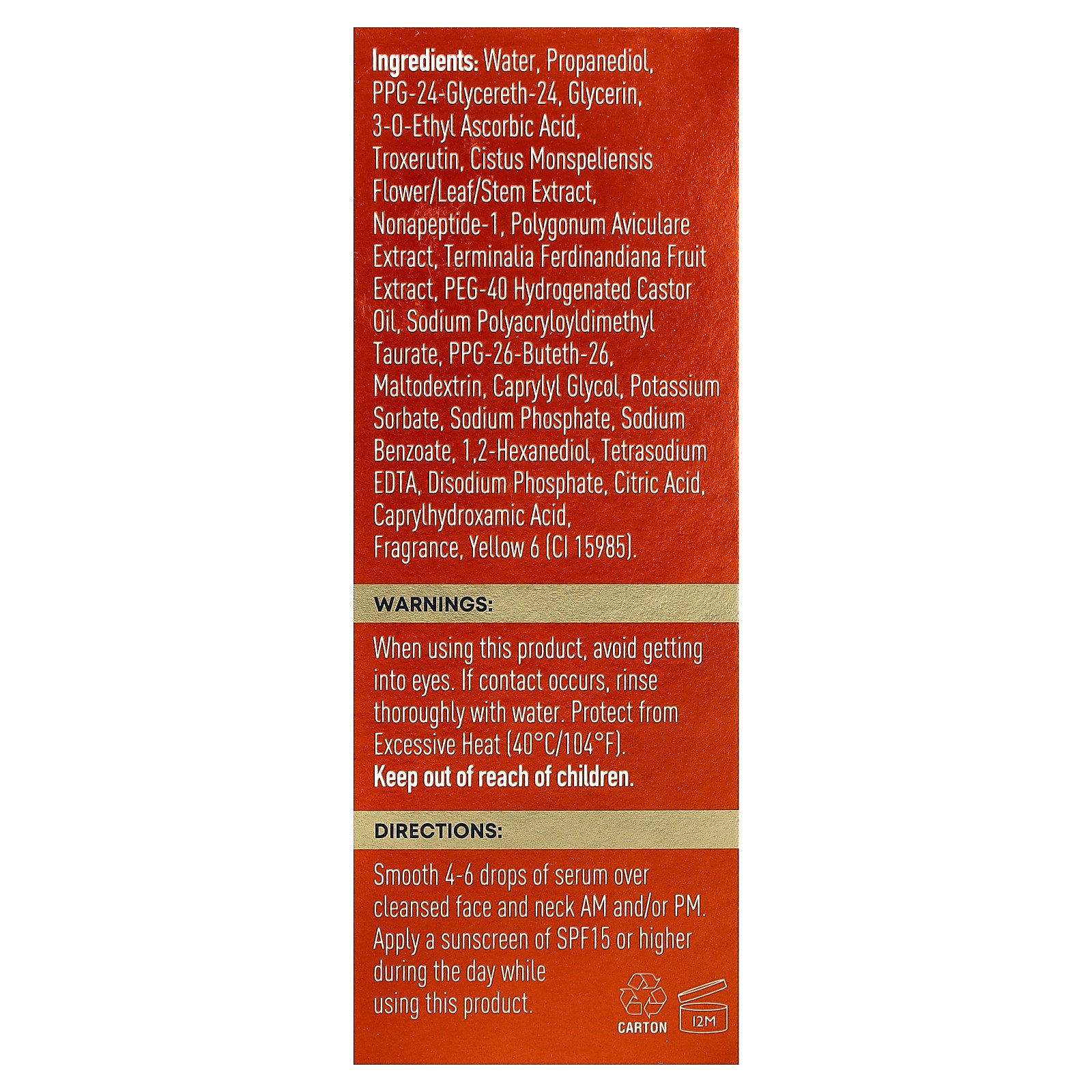 Water, propanediol, ppg-24-glycereth-24, glycerin, 3-0-ethyl ascorbic acid, troxerutin, cistus monspeliensis flower/leaf/stem extract, nonapeptide-1, polygonum aviculare extract, terminalia ferdinandiana fruit extract, peg-40 hydrogenated castor oil, sodium polyacryloyldimethyl taurate, ppg-26-buteth-26, maltodextrin, caprylyl glycol, potassium sorbate, sodium phosphate, sodium benzoate, 1,2-hexanediol, tetrasodium edta, disodium phosphate, citric acid, caprylhydroxamic acid, fragrance, yellow 6 (ci 15985).