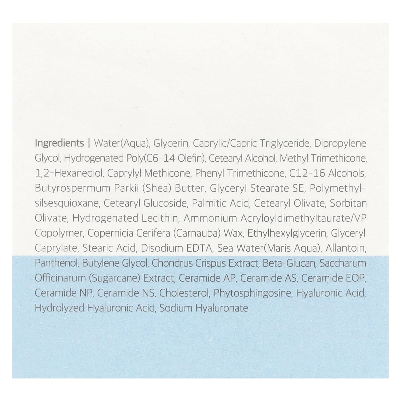 Water, glycerin, caprylic/capric triglyceride, dipropylene glycol, hydrogenated poly (c6-14 olefin), cetearyl alcohol, methyl trimethicone, 1,2-hexanediol, caprylyl methicone, phenyl trimethicone, c12-16 alcohols, butyrospermum parkii (shea) butter, glyceryl stearate se, polymethyl- silsesquioxane, cetearyl glucoside, palmitic acid, cetearyl olivate, sorbitan olivate, hydrogenated lecithin, ammonium acryloyldimethyltaurate/vp copolymer, copernicia cerifera (carnauba) wax, ethylhexylglycerin, glyceryl caprylate, stearic acid, disodium edta, sea water (maris aqua), allantoin, panthenol, butylene glycol, chondrus crispus extract, beta-glucan, saccharum officinarum (sugarcane) extract, ceramide ap, ceramide as, ceramide eop ceramide np, ceramide ns, cholesterol, phytosphingosine, hyaluronic acid, hydrolyzed hyaluronic acid, sodium hyaluronate.