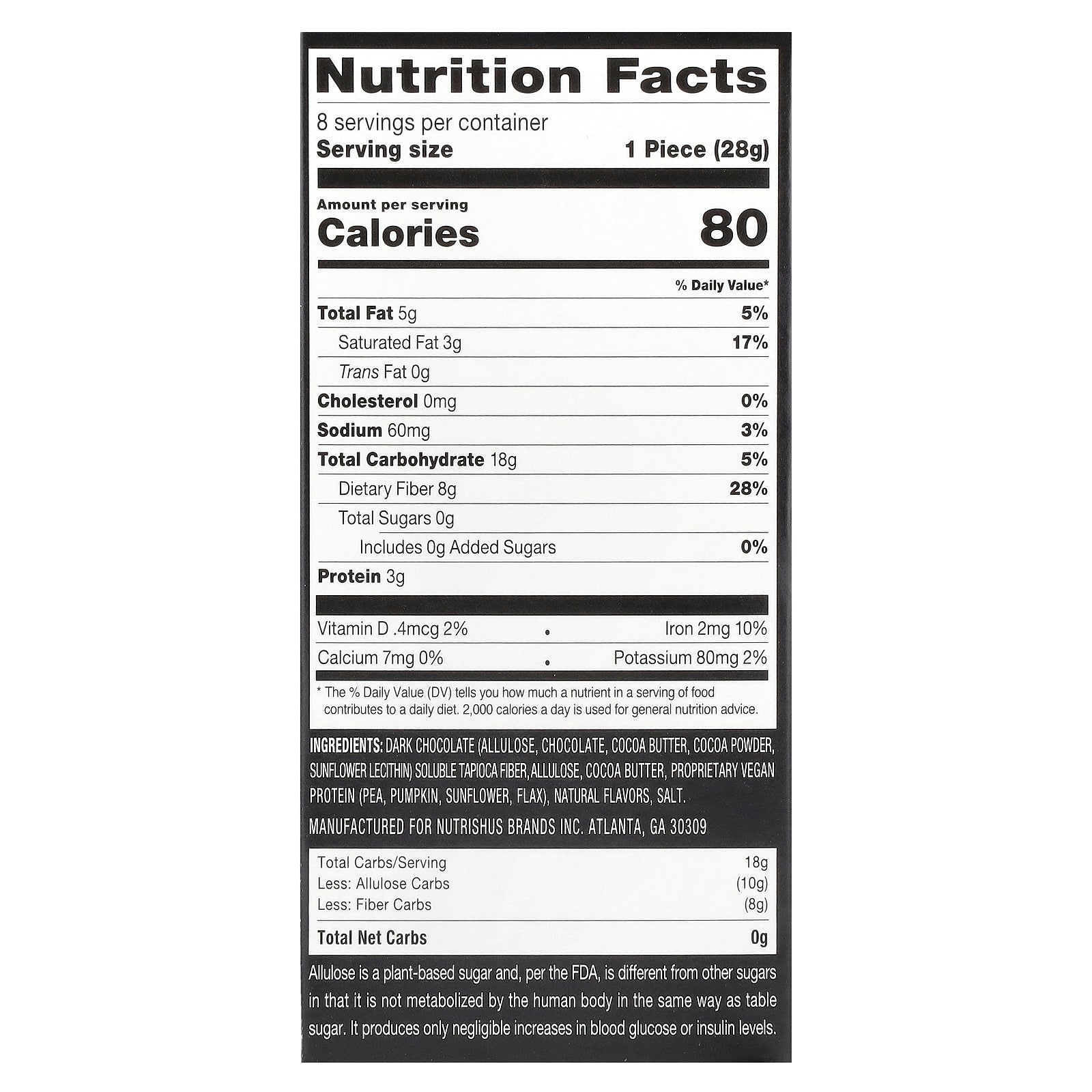Dark chocolate (allulose, chocolate, cocoa butter, cocoa powder, sunflower lecithin) soluble tapioca fiber, allulose, cocoa butter, proprietary vegan protein (pea, pumpkin, sunflower, flax), natural flavors, salt.